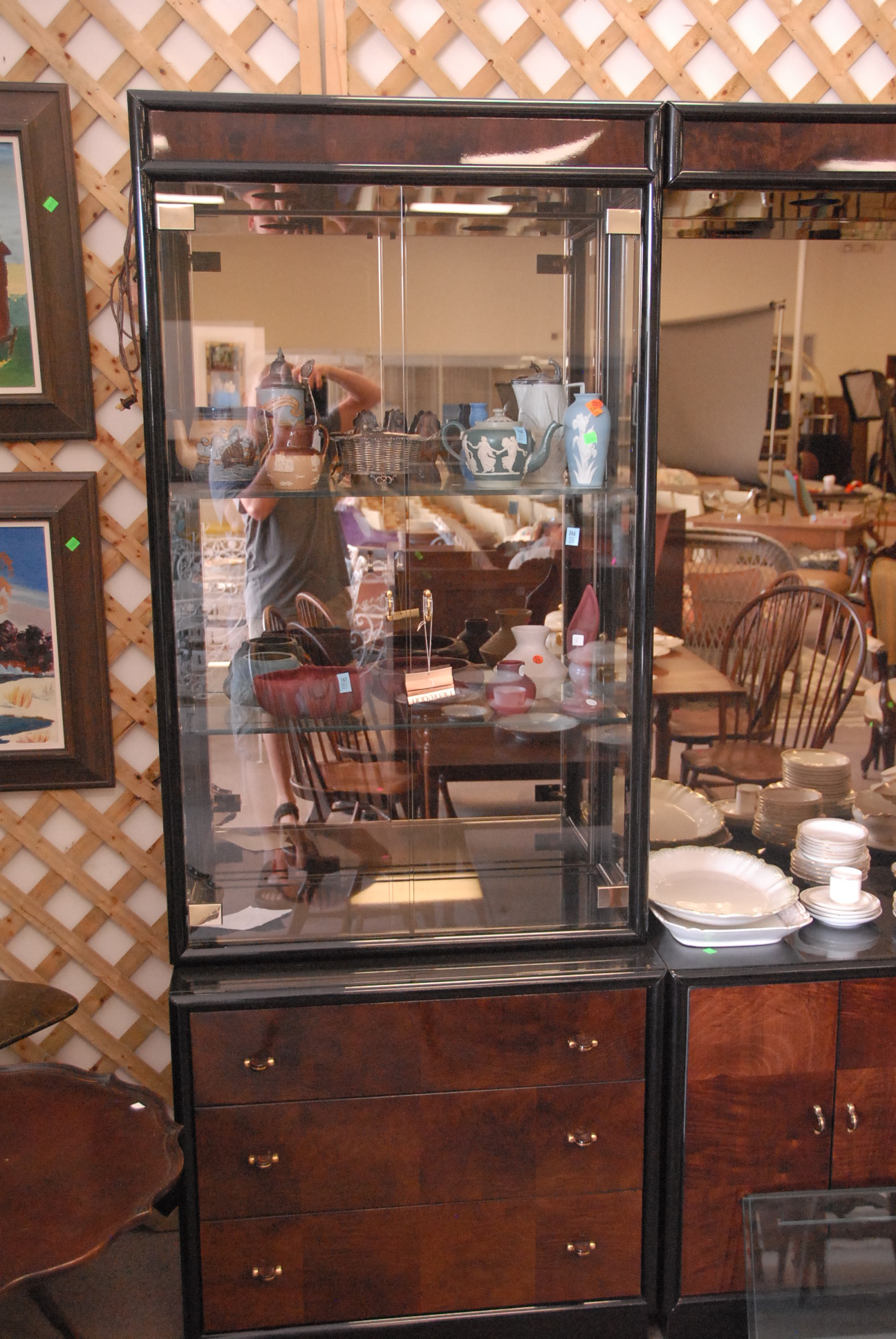Henredon black lacquered three part cabinet with glass doors, glass shelves, and mirrored back having doors and drawers in base, ht. 92in. wd. 109in. dp. 19in.