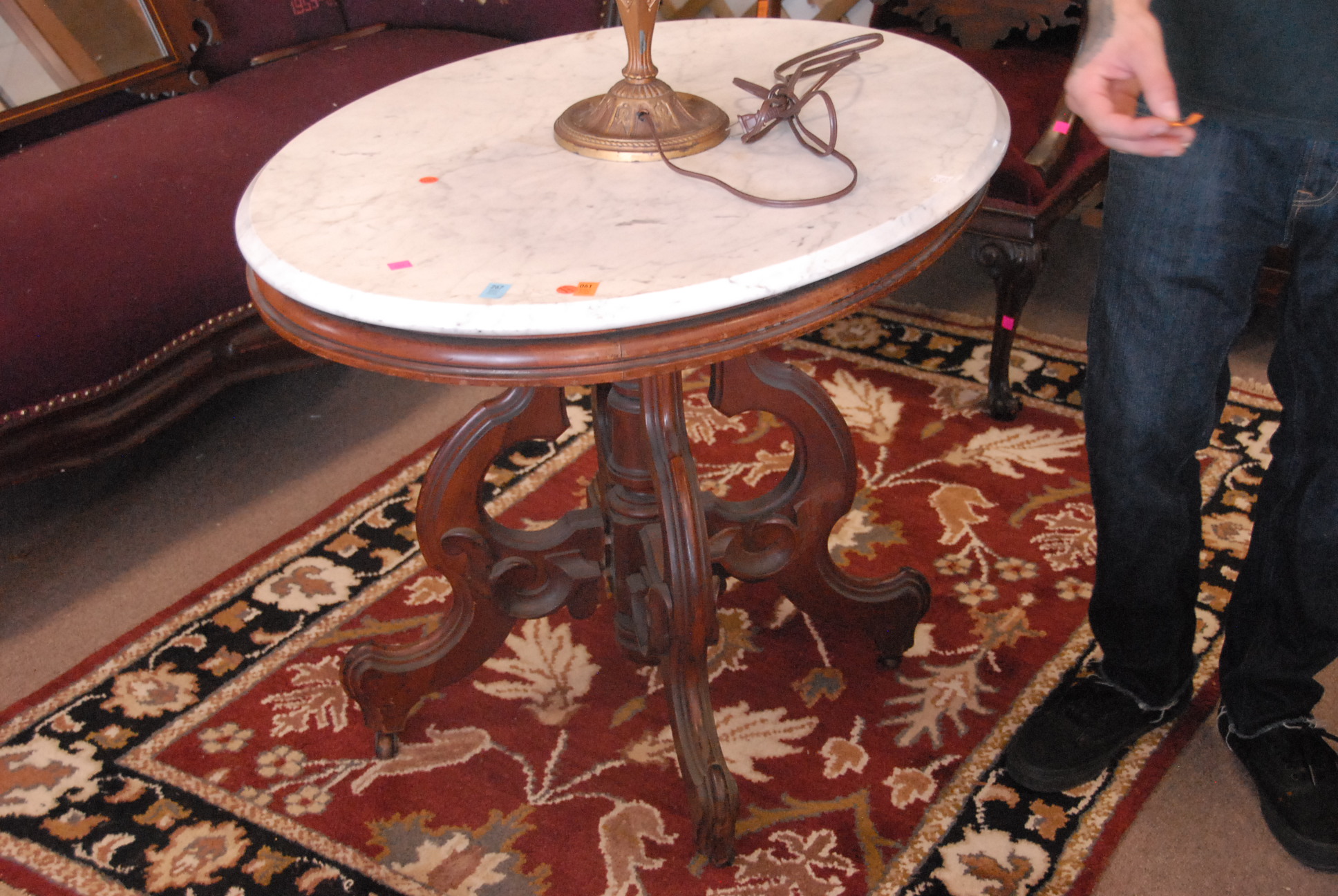 Oval Victorian marble top table, ht. 29in. top: 28 x 37.