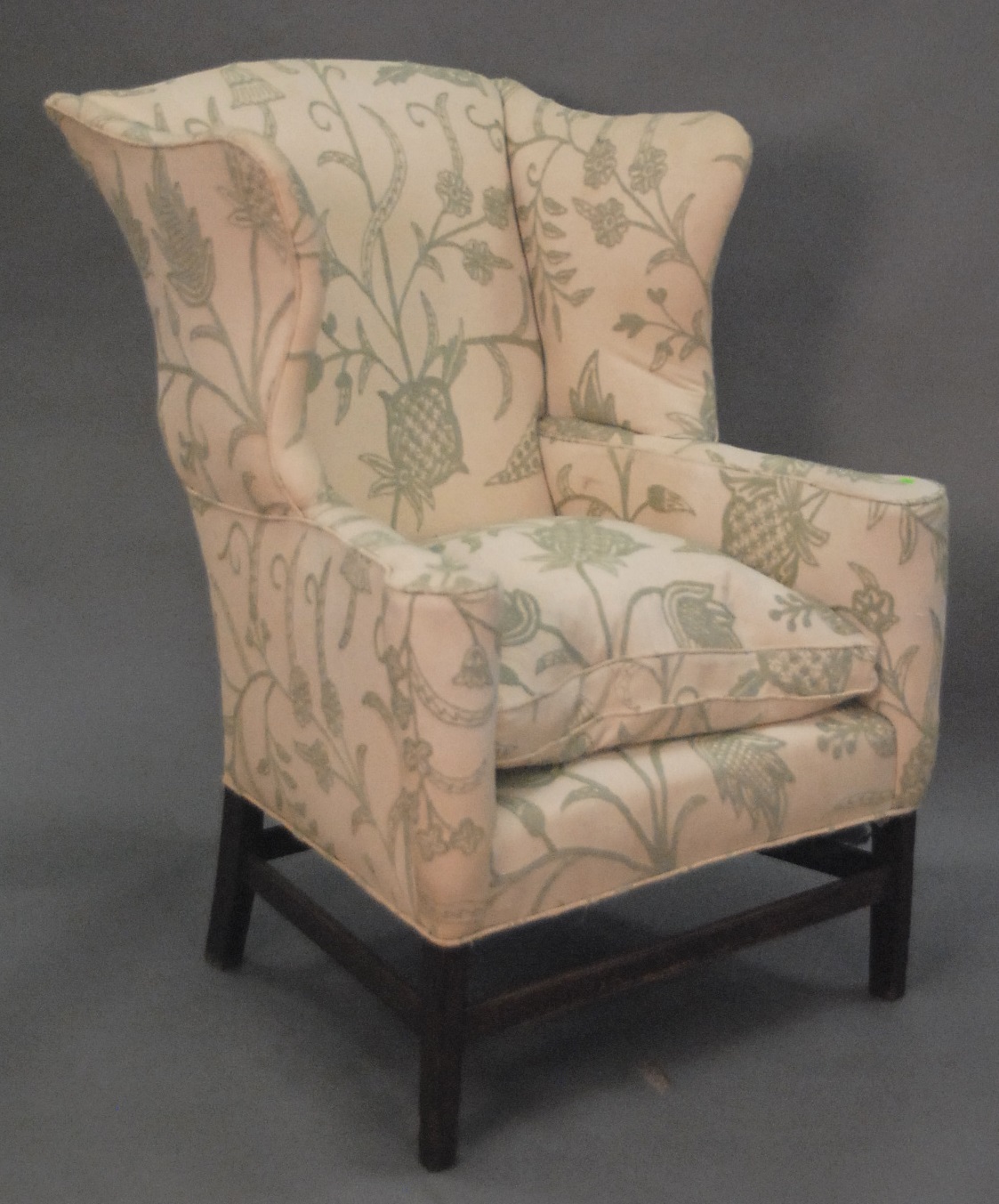 Chippendale style upholstered wing chair with crewel work upholstery.