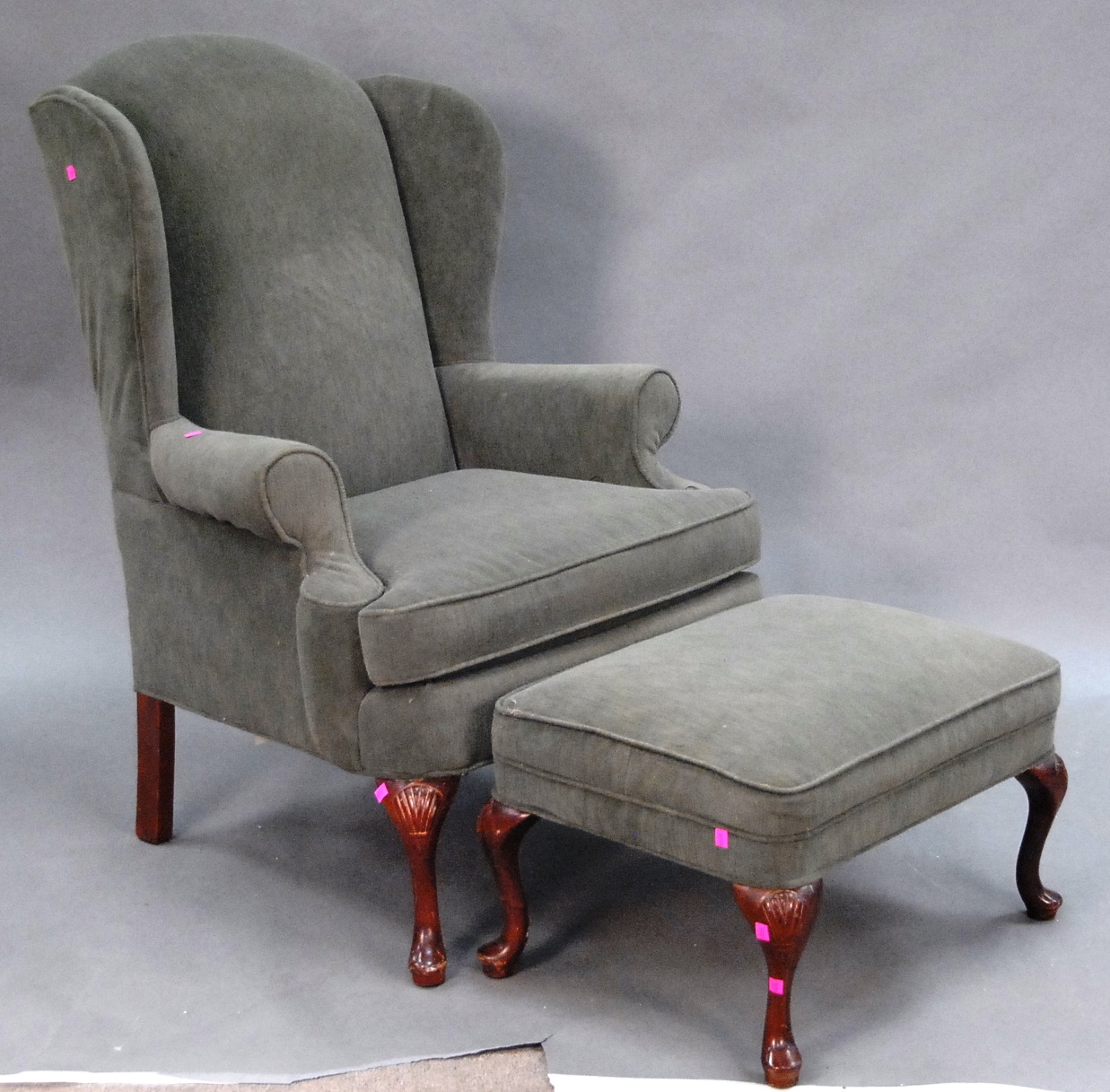 Queen Anne style upholstered wing chair and ottoman.