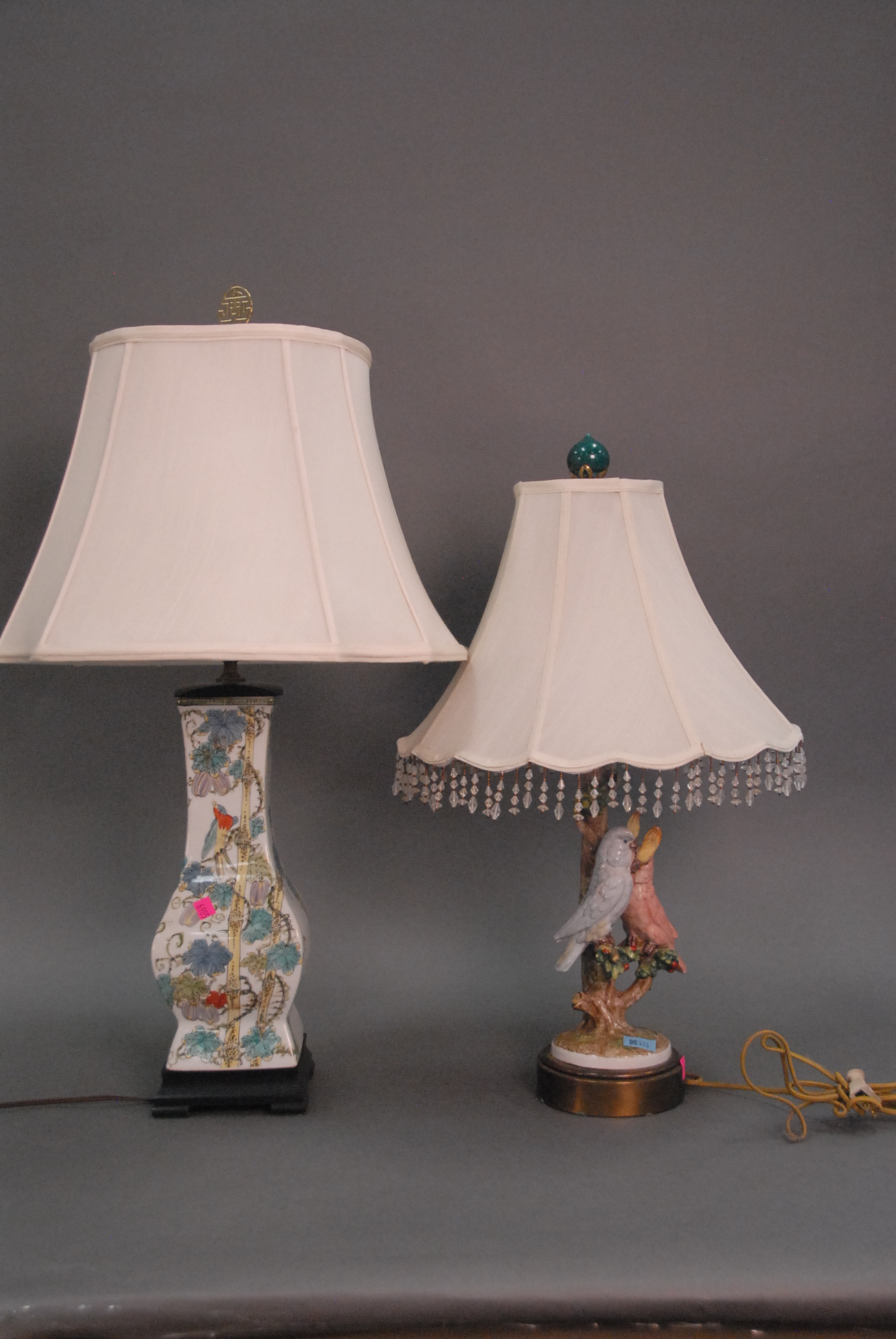 Two table lamps Oriental square vase made into table lamp and porcelain parrot table lamp.
