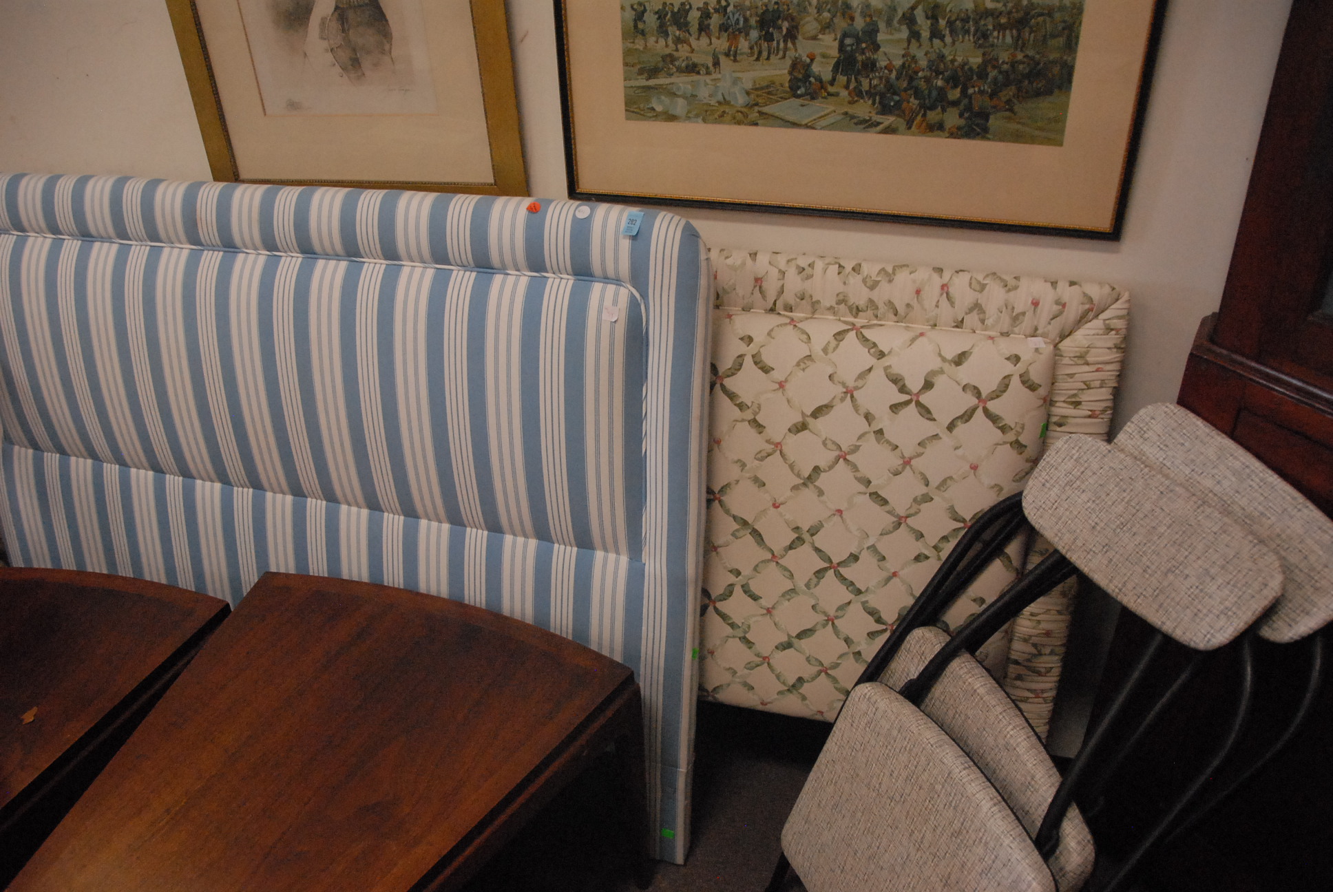 Two upholstered headboards: king size and double size, double size comes with bed cover and pillows blue striped.