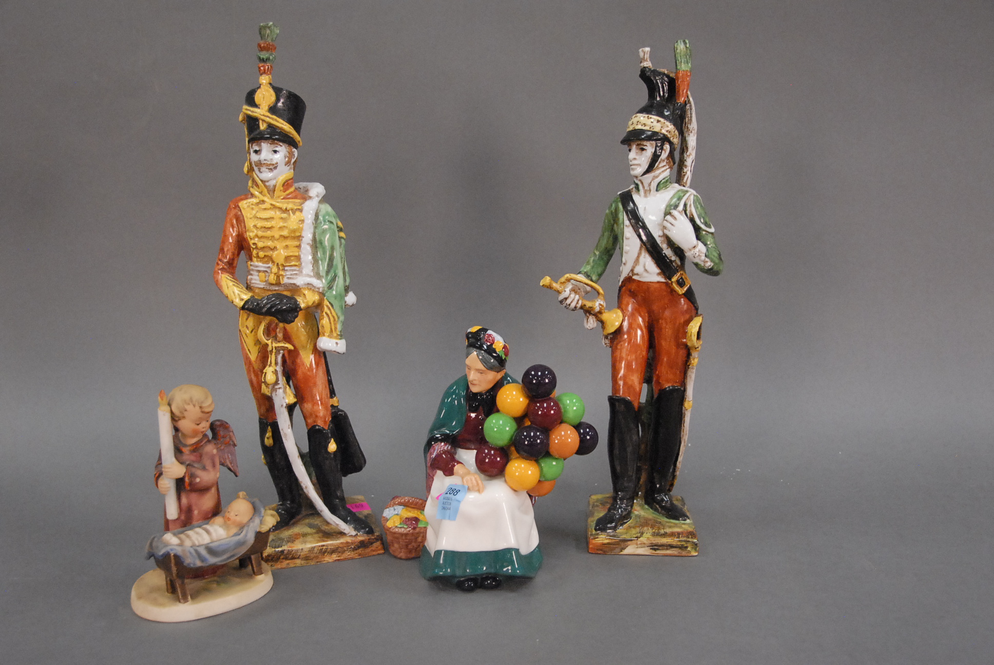 Group lot to include Hummel, Royal Doulton figure, and two Italian Majolica figures decorated by hand Royal Mayolyga.