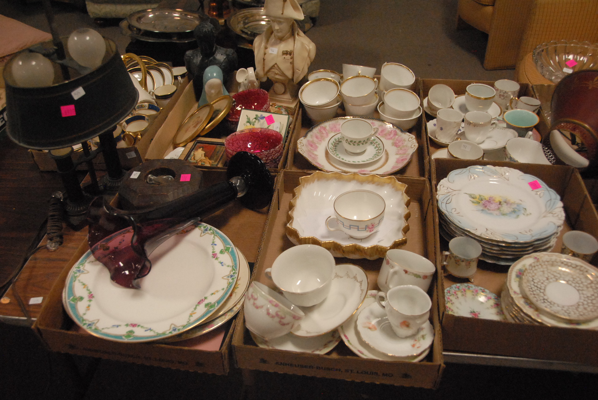 Seven box lots to include desk lamp, several plates, cups, saucers, Lenox teapot and cups, Napoleon plaster bust figures, cranberry bowls.