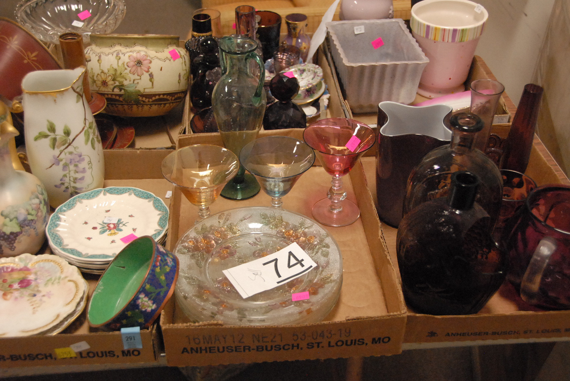 Six box lots to include Teplitz urn, Amethyst glass, hand painted china, vases, etc.