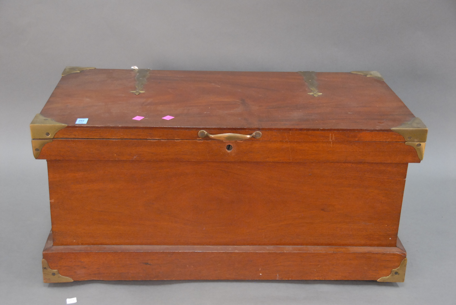 Mahogany brass bound lift top box with contents.
