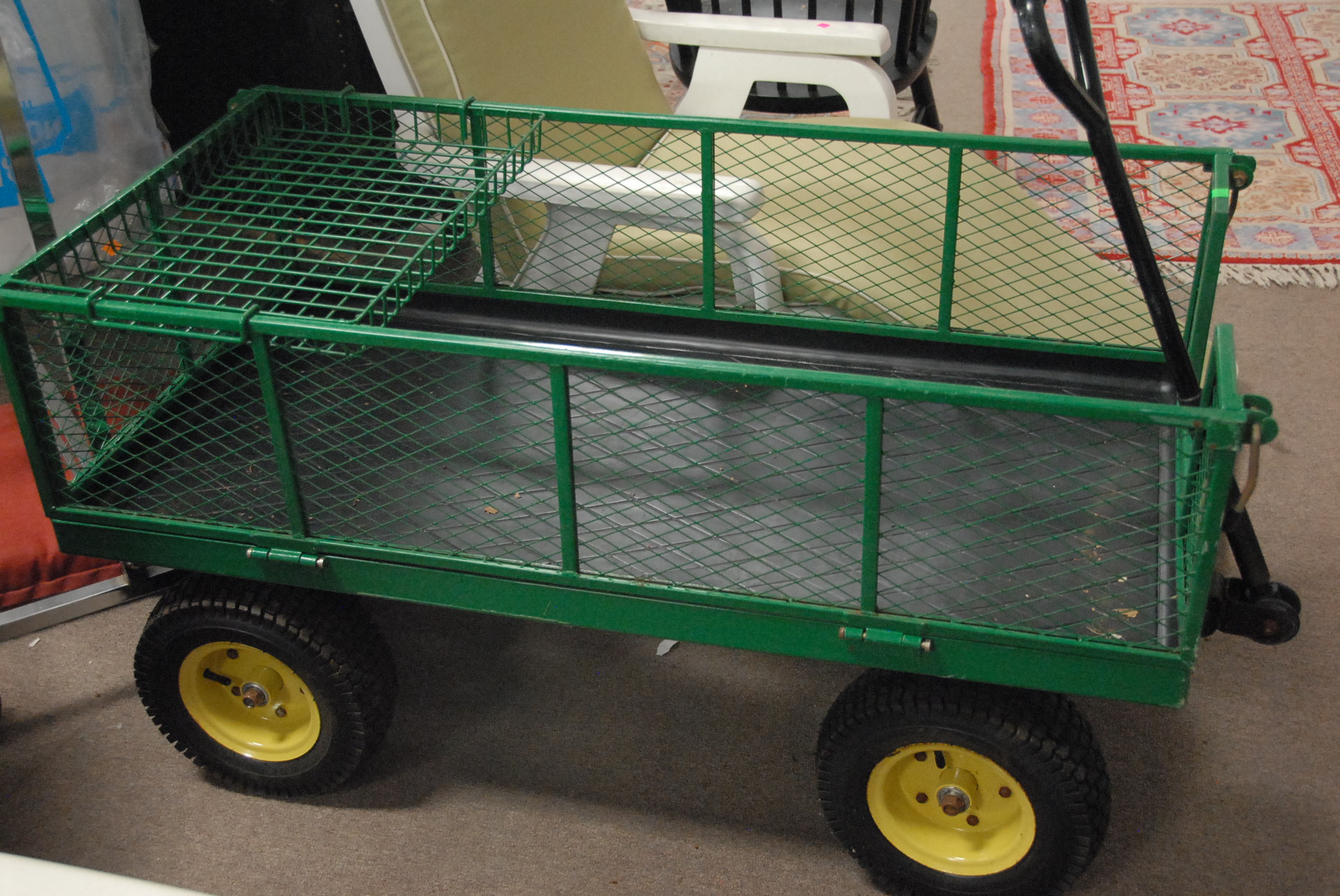 John Deere wagon / cart with large wheels, sides and back drop.