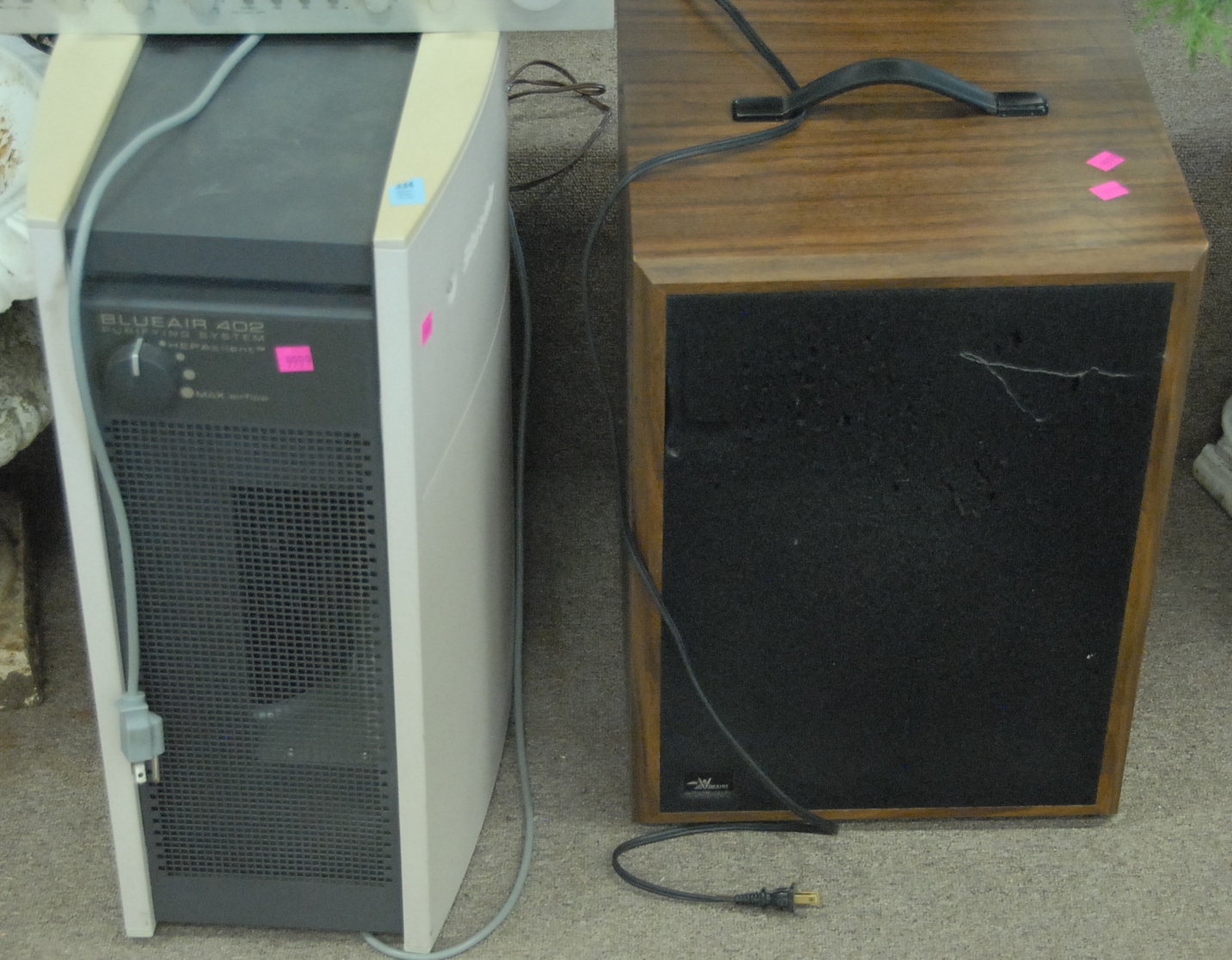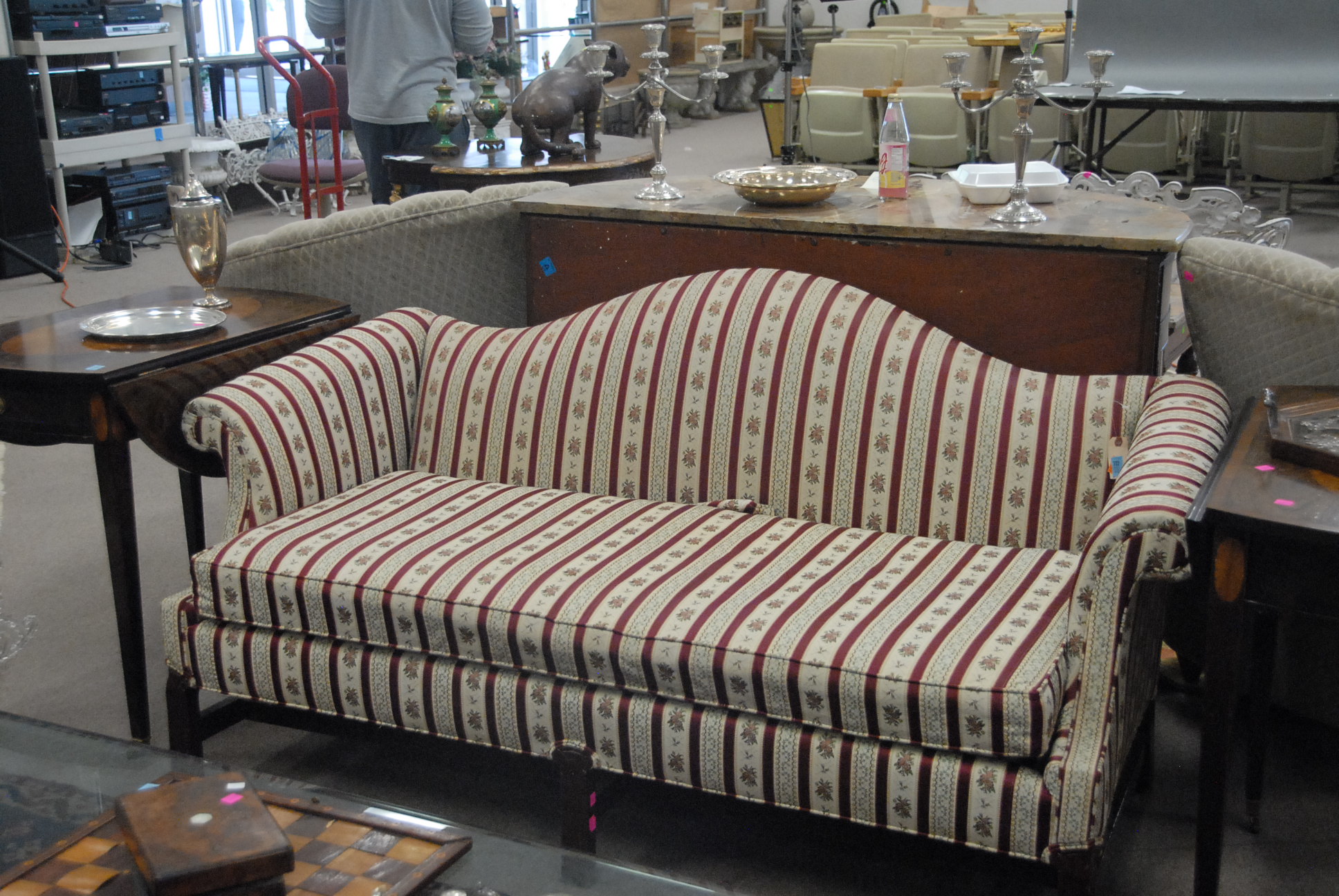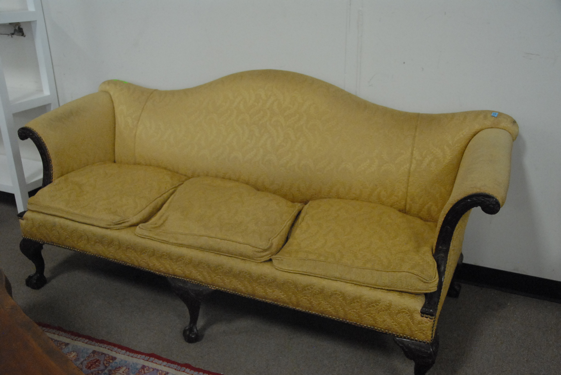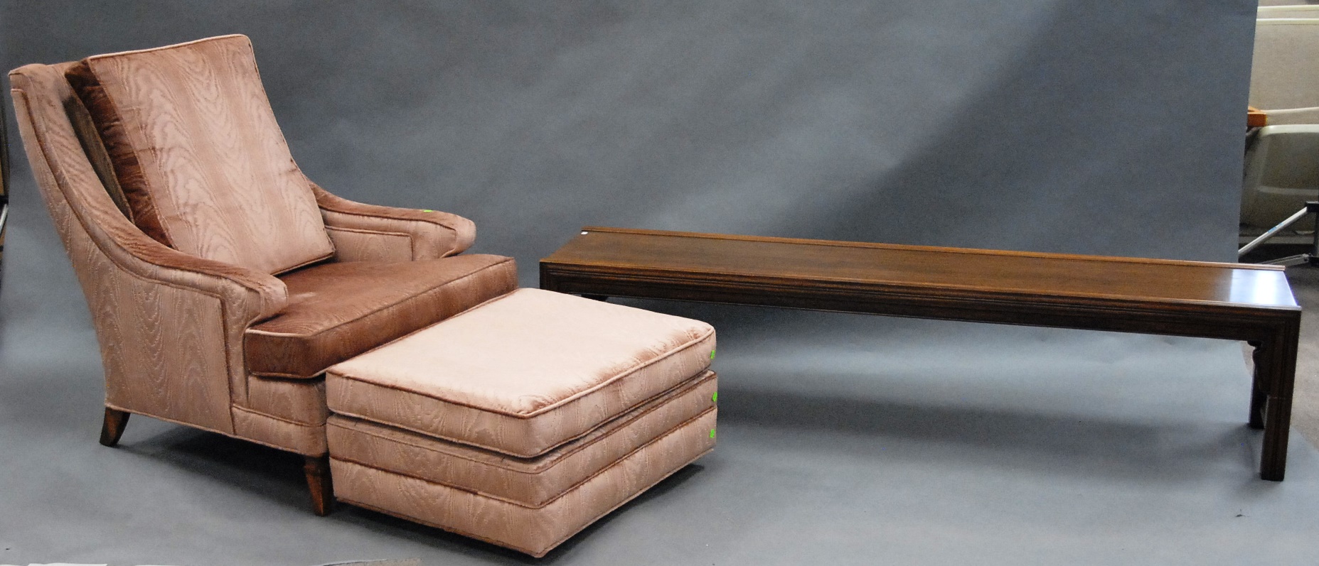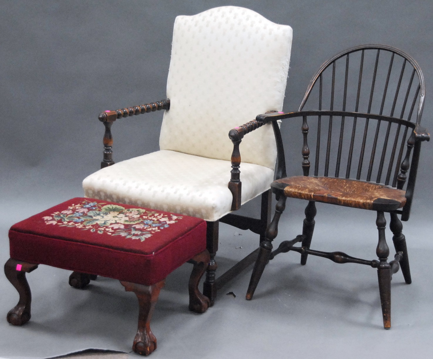 Group lot including pair of Infinity speakers, footstool with ball and claw feet, mahogany night table, cherry night table, Windsor style chair, and English style armchair.
