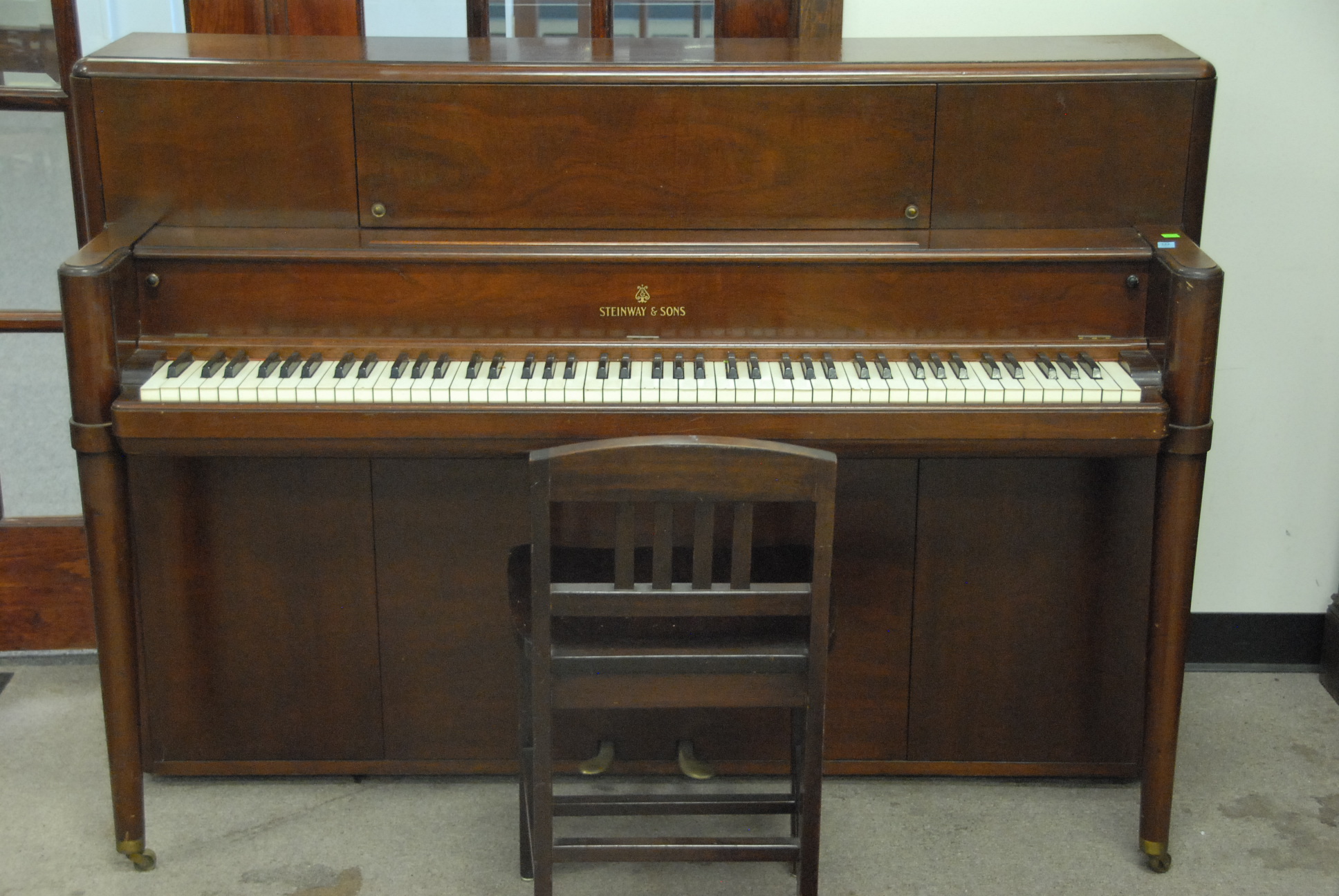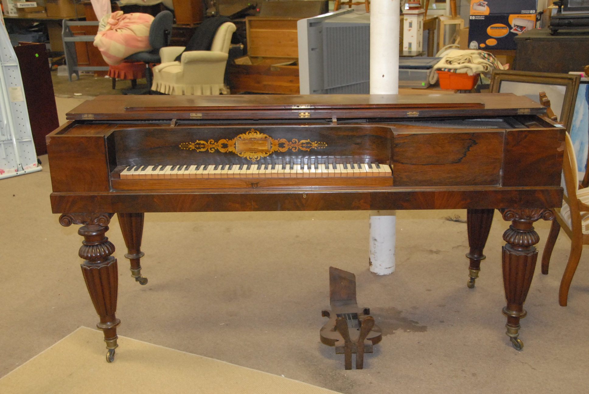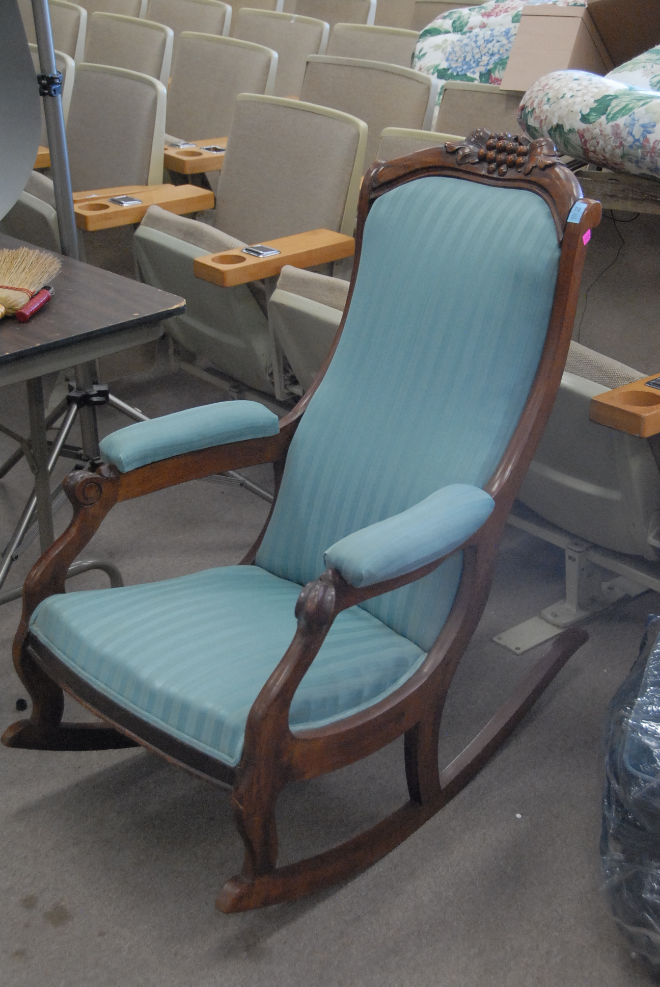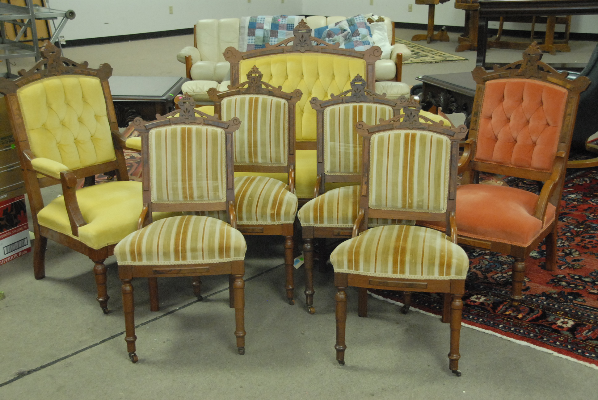 Group lot including pair of Infinity speakers, footstool with ball and claw feet, mahogany night table, cherry night table, Windsor style chair, and English style armchair.