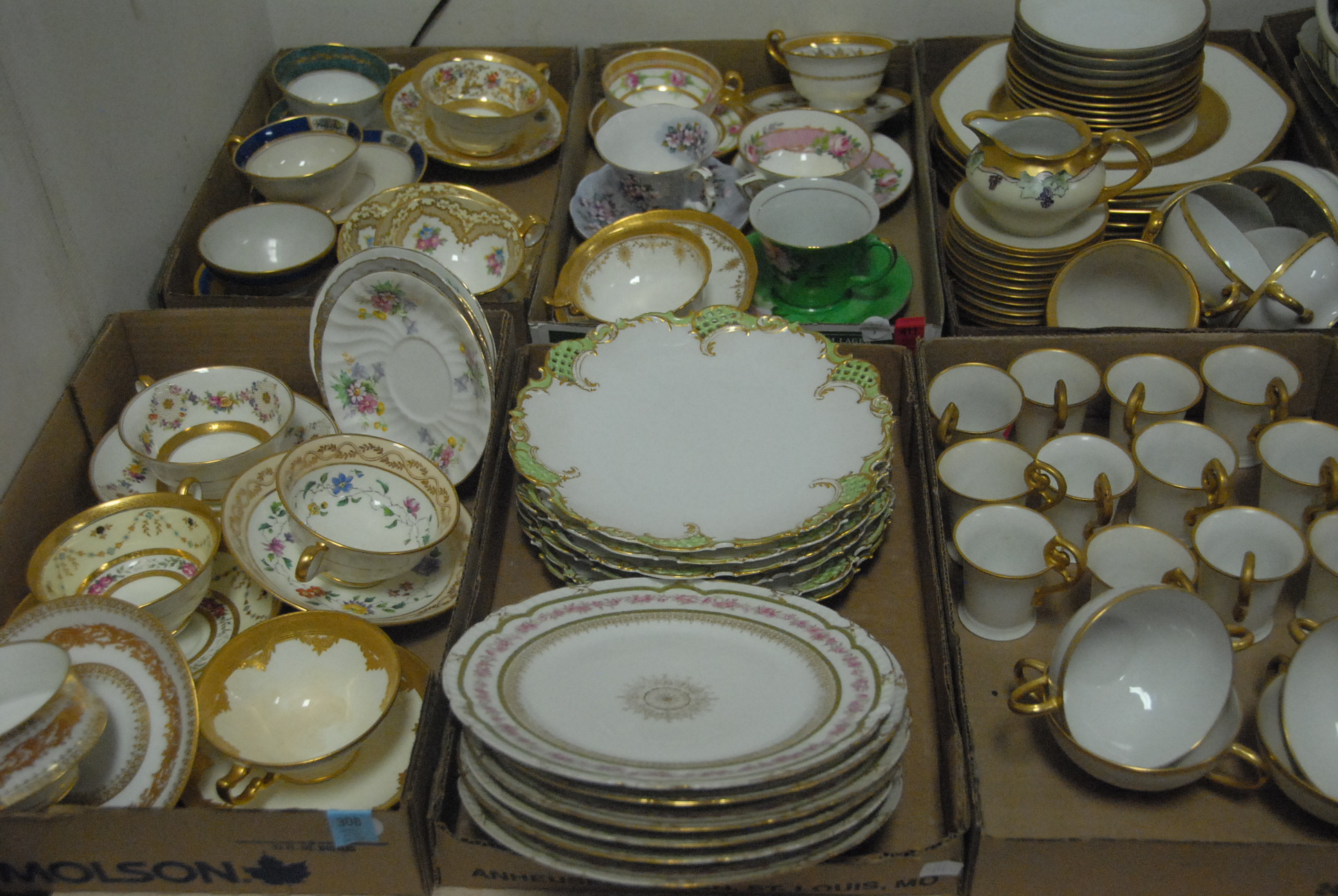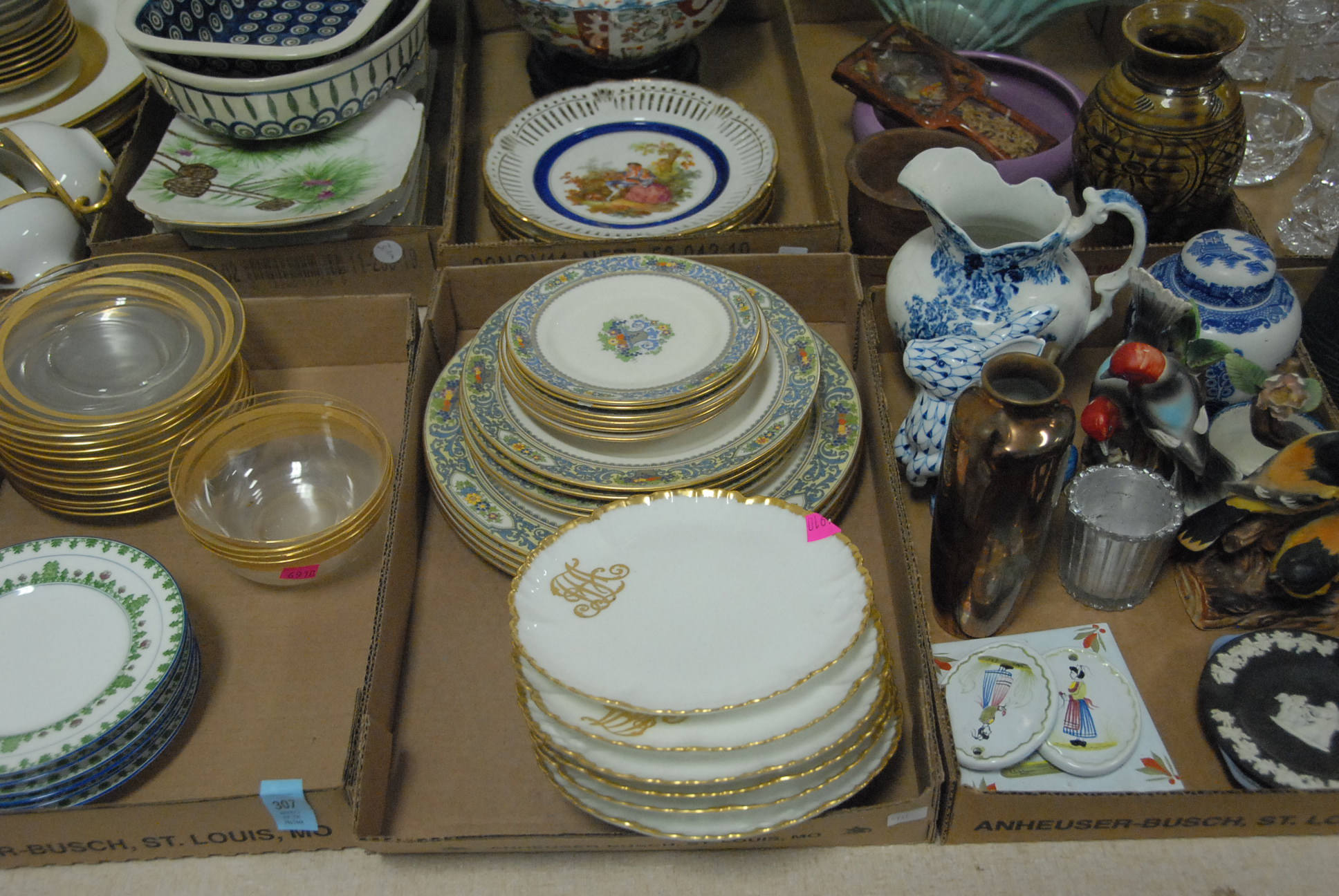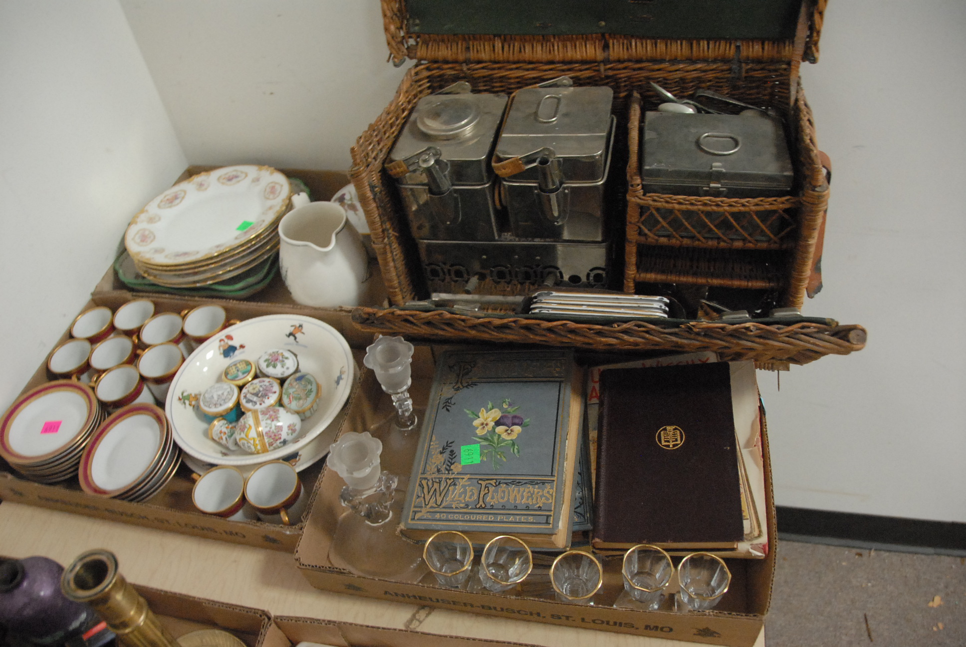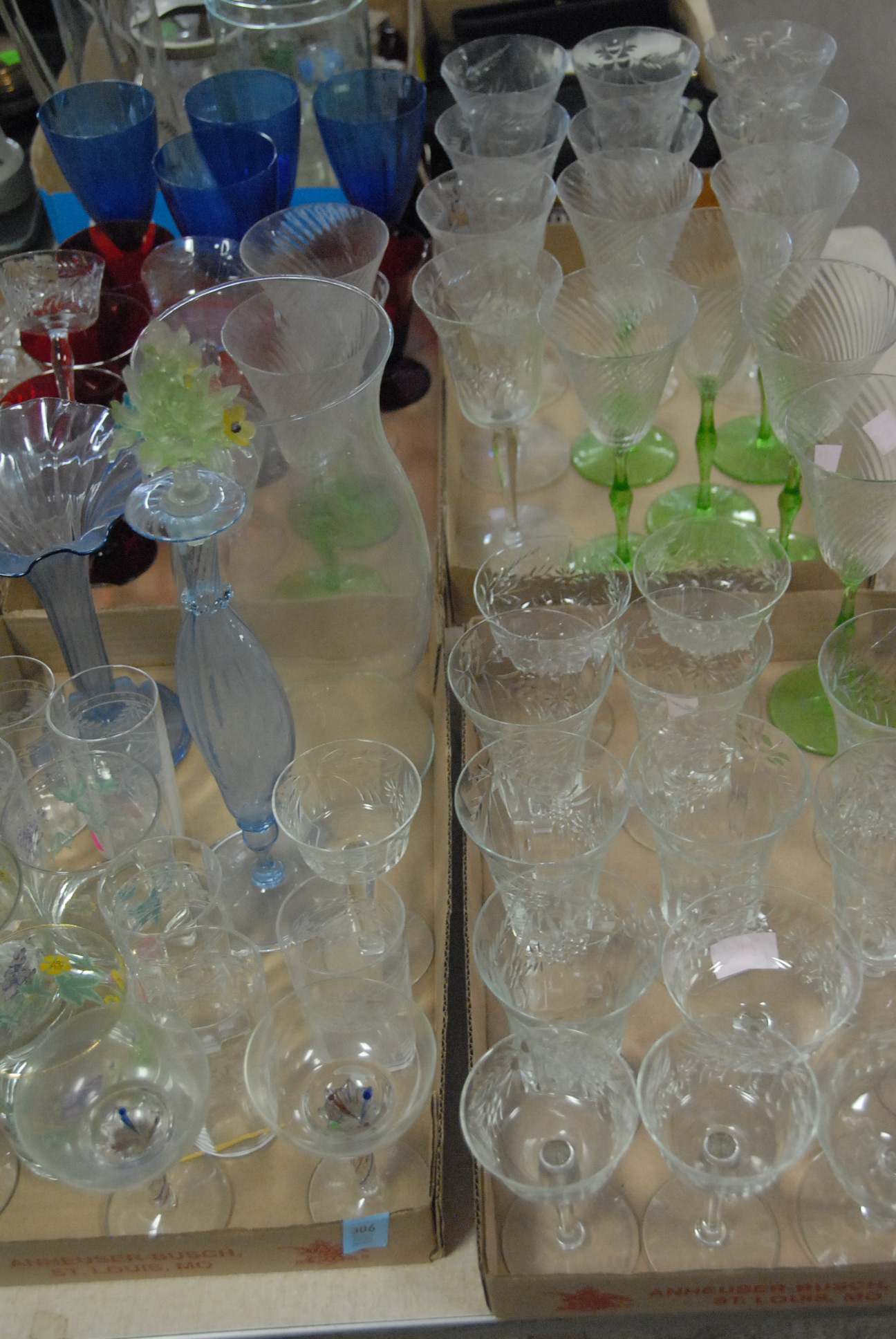 Five box lots of various stemware, partial sets, swirl tops with green bottoms, cobalt blue stems, Venetian glass vase, Venetian glass cologne bottle with stopper, cut crystal, small dishes, etc.