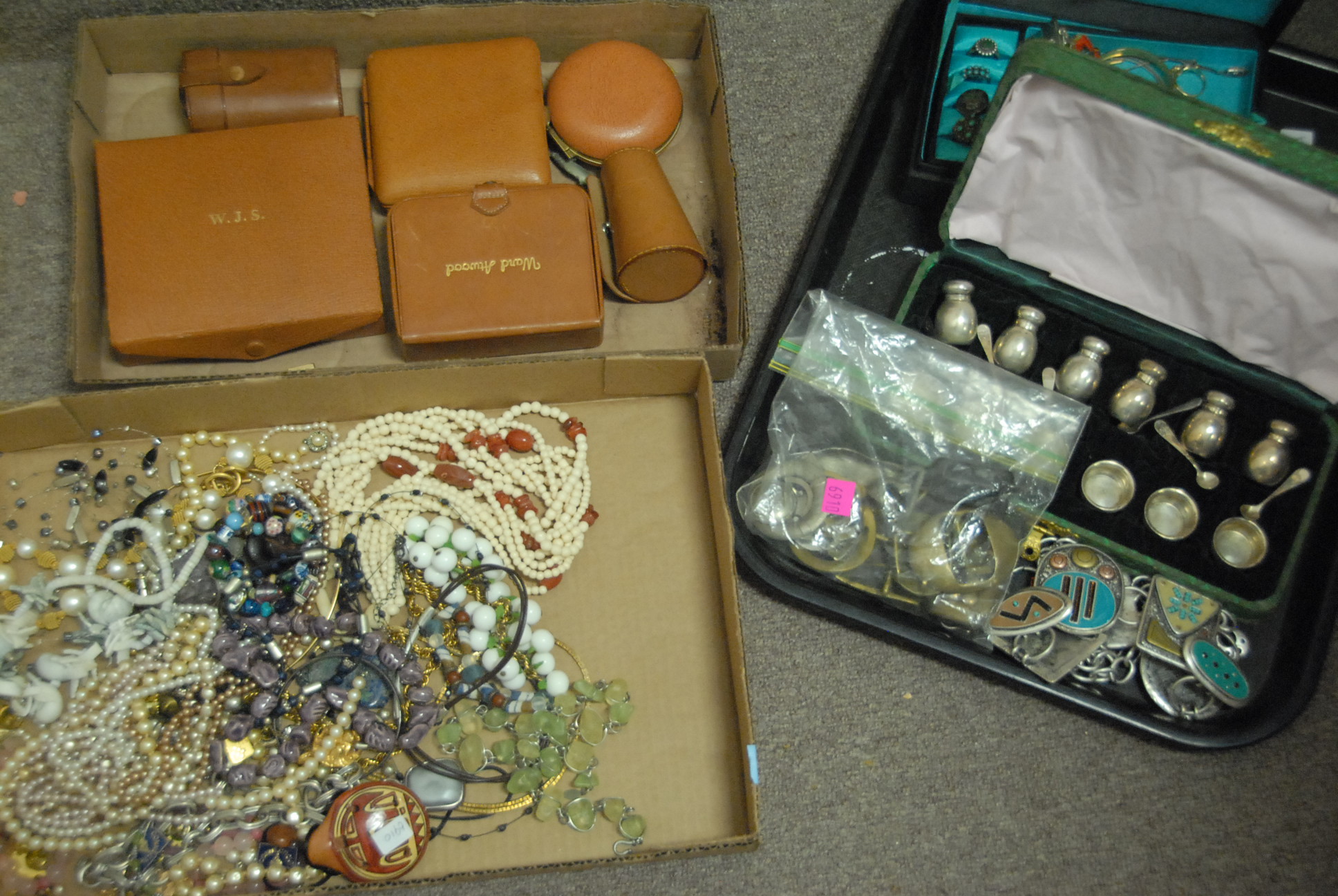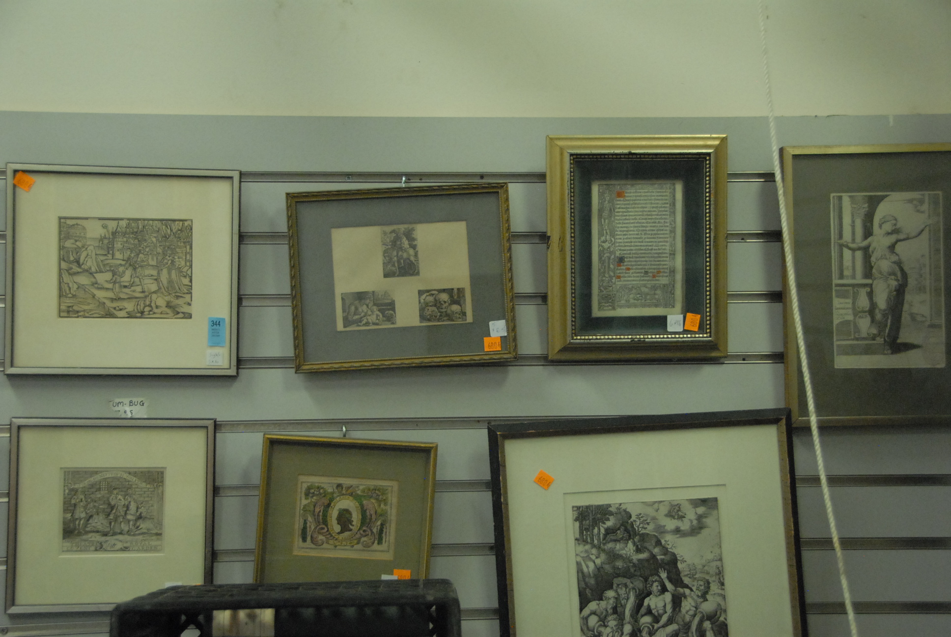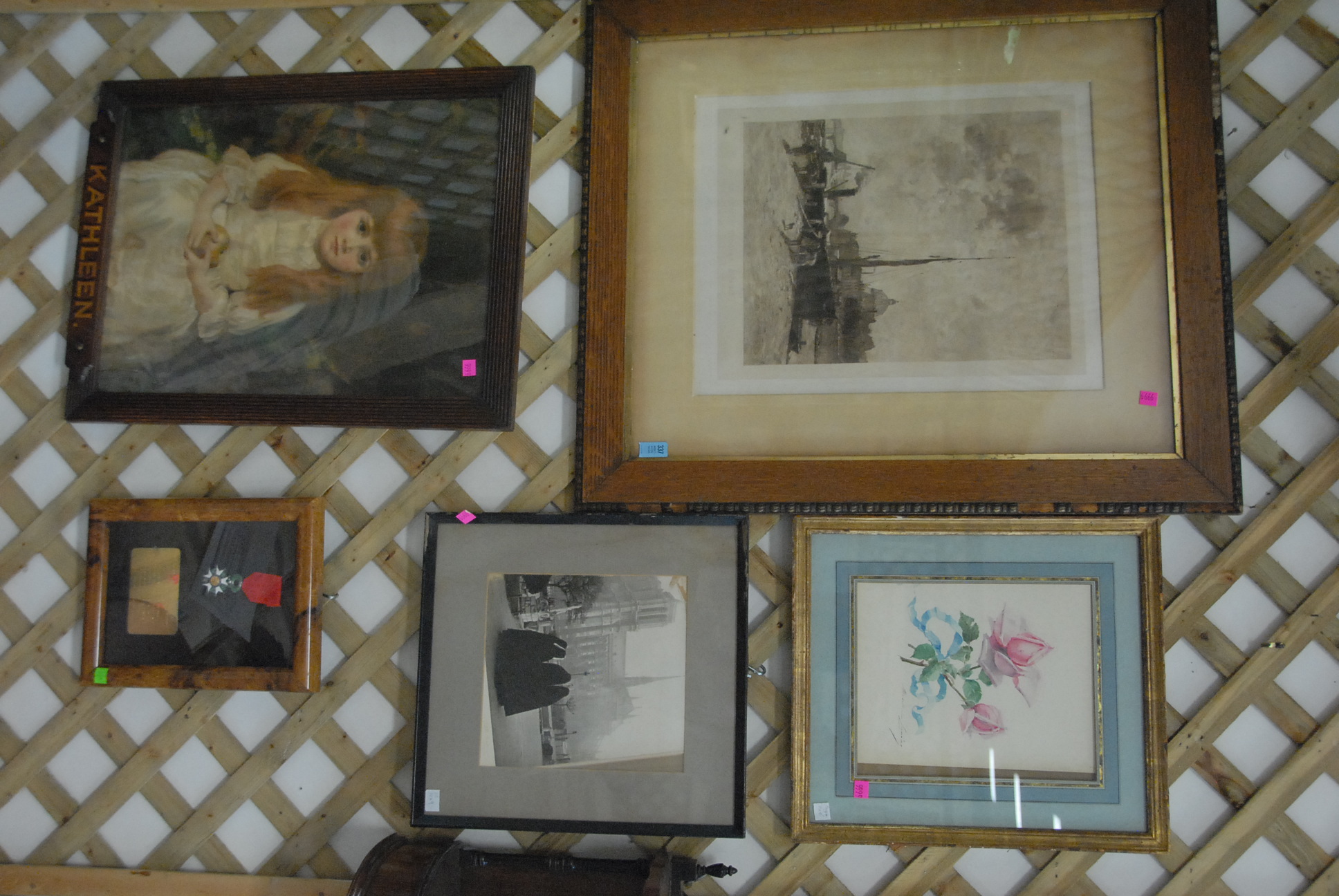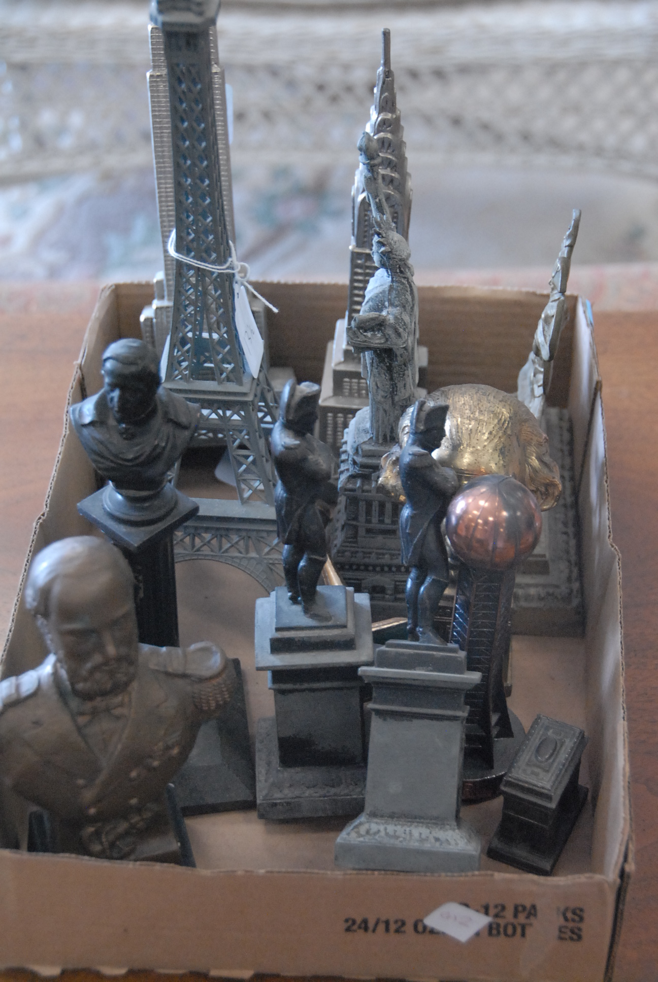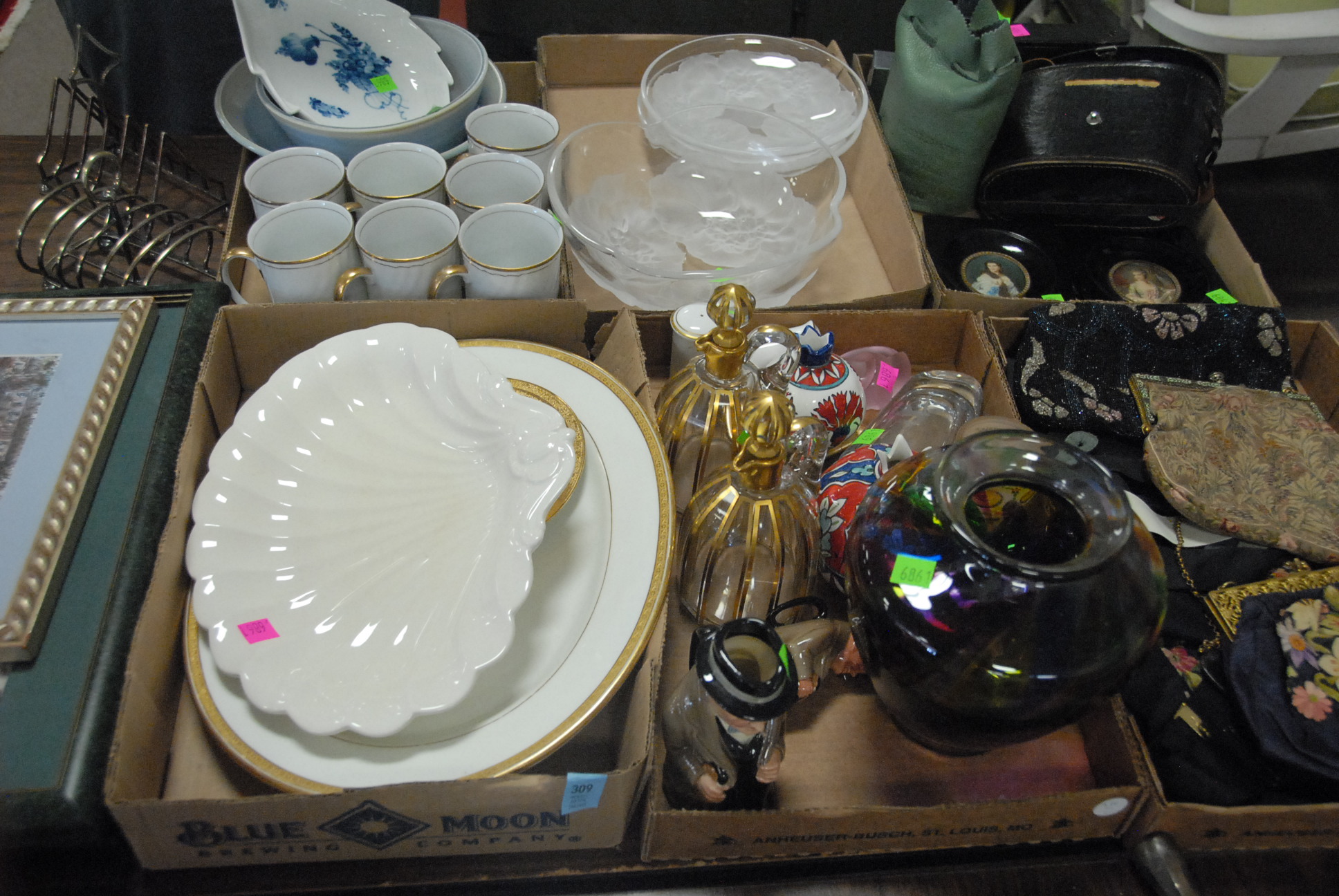 Seven box lots to include evening bags, two miniature portraits, binoculars, camera, prints, silverplated toast holders, two Royal Doulton Winston Churchill Tobys, and misc.