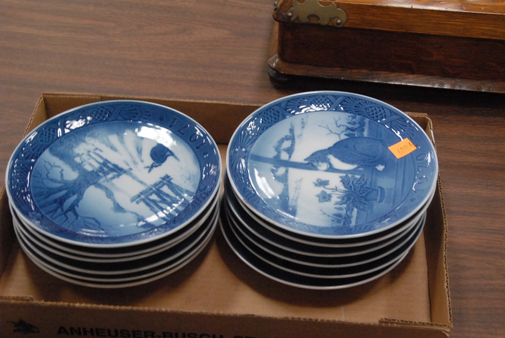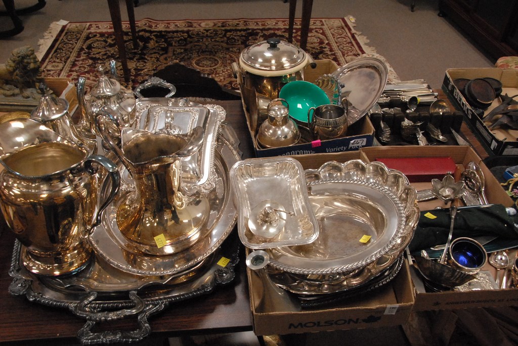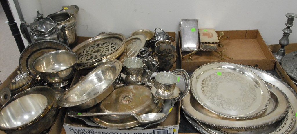 Eight box lots: two silverplated baskets, Revere style bowls, several trays, gravy boats, copper tea pot, fish mold, crystal decanter,
