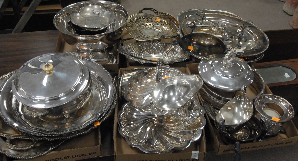 Five box lots silverplated items: trays, bowls, vegetable dish, etc.