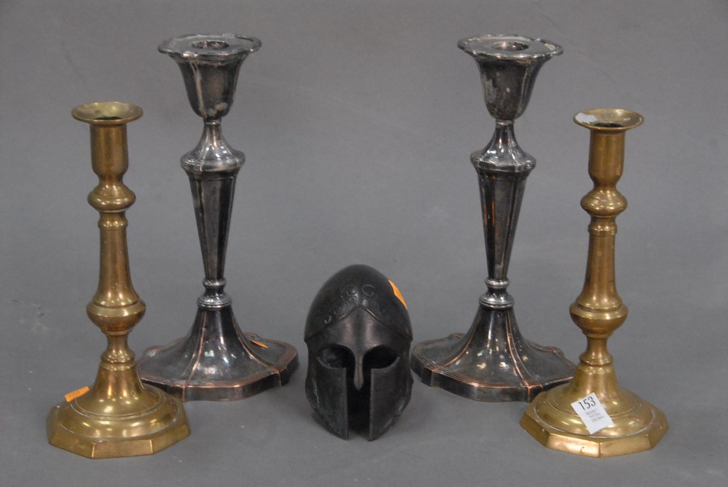 Group lot including two Sheffield silverplated candlesticks, pair of brass push up candlesticks, and bronze helmet.
