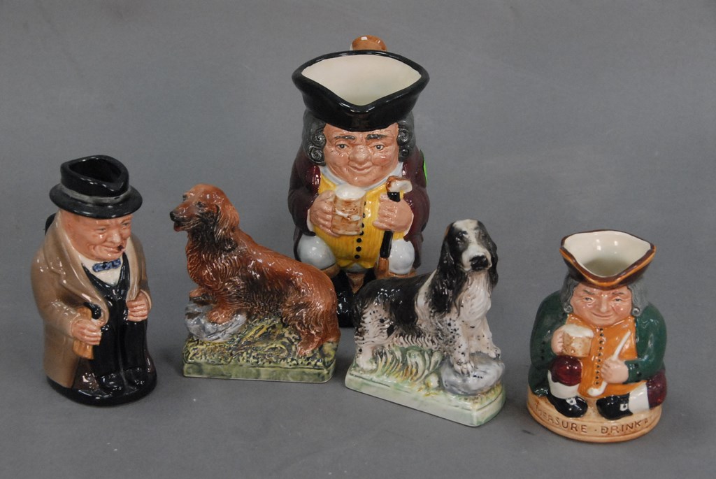 Five piece lot: three Royal Doulton Toby jugs and two dog figural liquor containers.