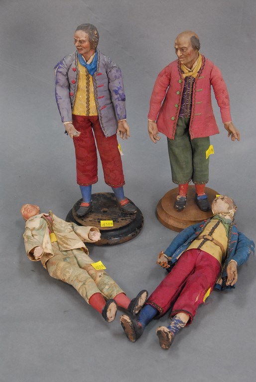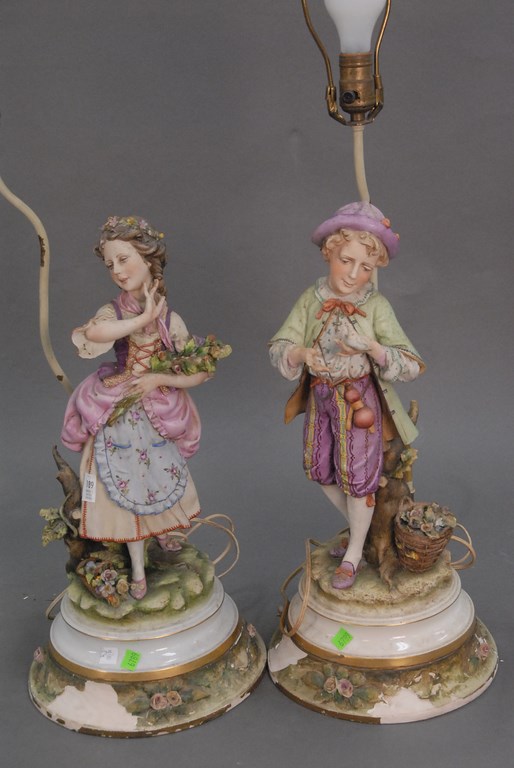 Pair of Bisque figures, now mounted as table lamps, signed on porcelain base B. Merli one finger missing, chip on headband, figure ht. 18 in.
