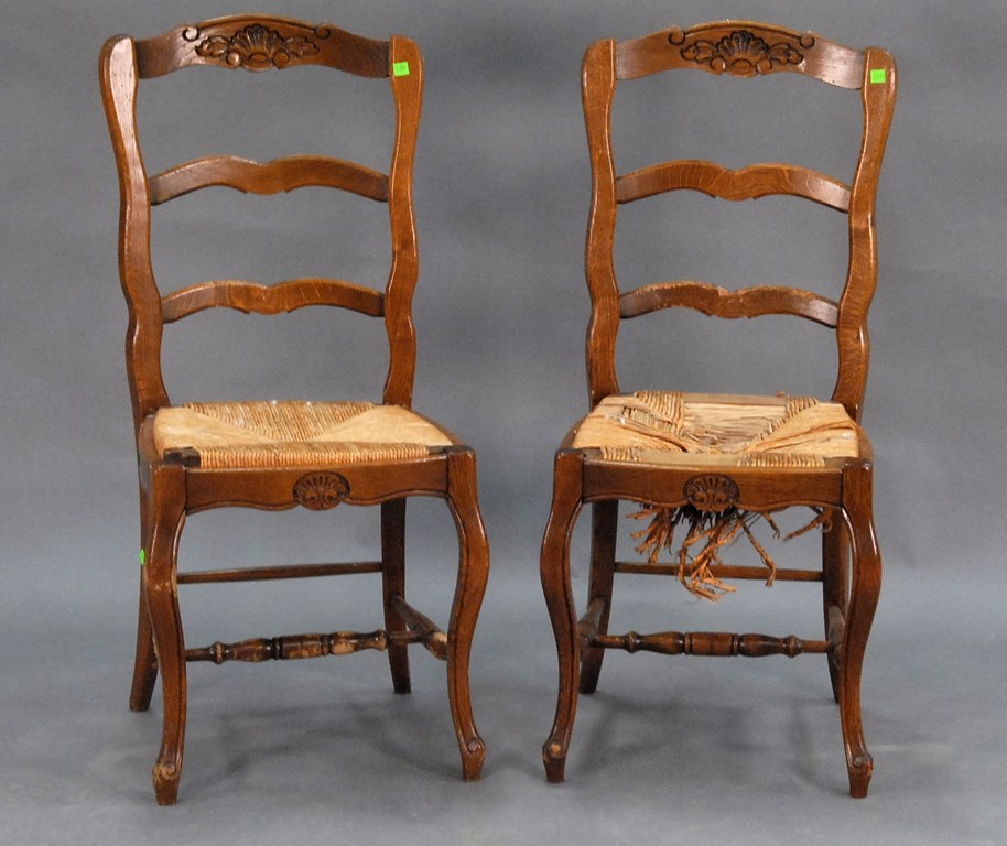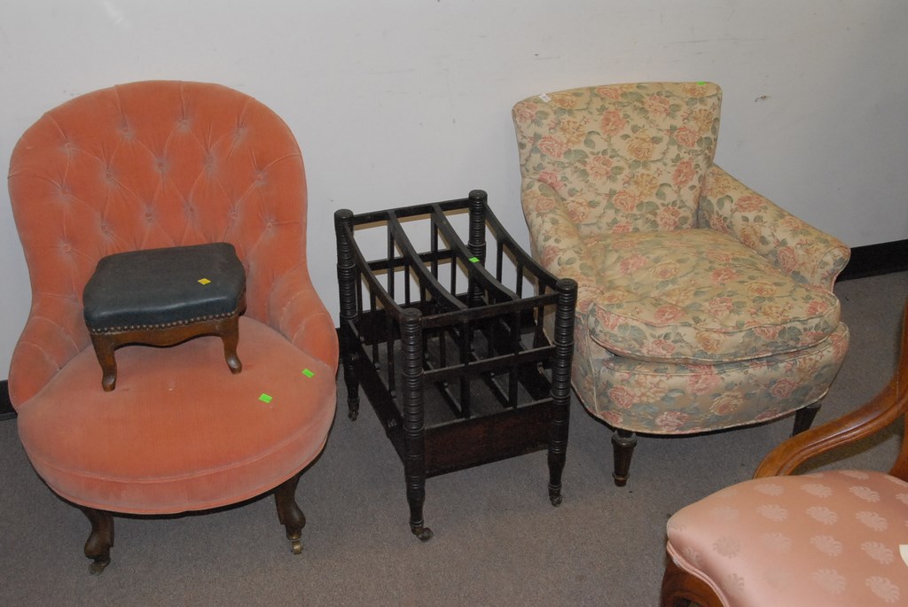 Four piece lot to include two boudoir chairs, magazine rack, and small footstool.