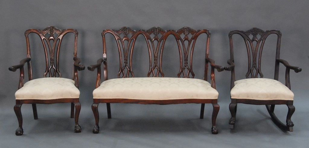 Three piece Chippendale mahogany set: loveseat, rocker, and armchair, all with ball and claw feet one arm lose.