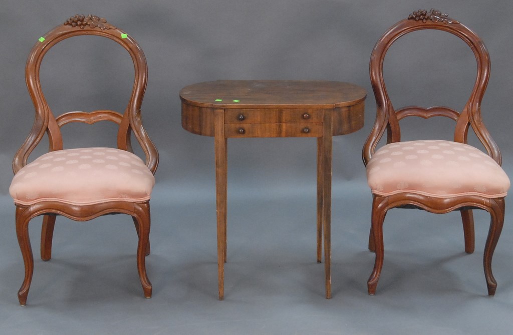 Three piece lot: two Victorian side chairs and small one drawer stand.