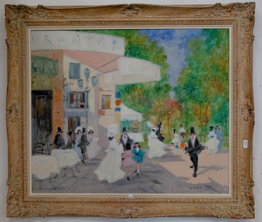 Luigi Cagliani 20th century, Parisian street scene with dancer, 30 x 35.