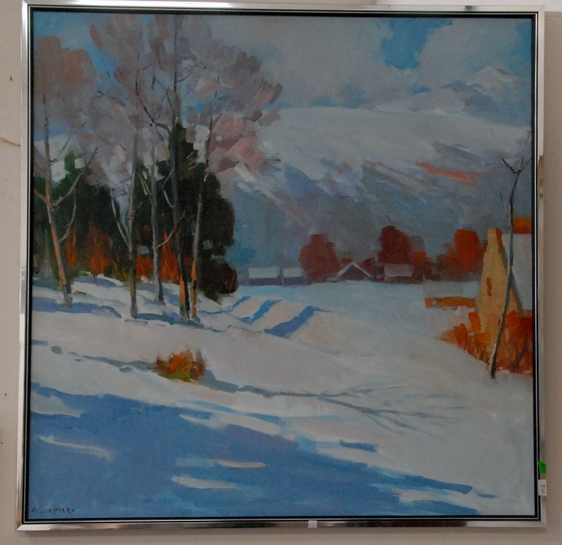 Oil on canvas winter scene signed lower left, 46 x 46.