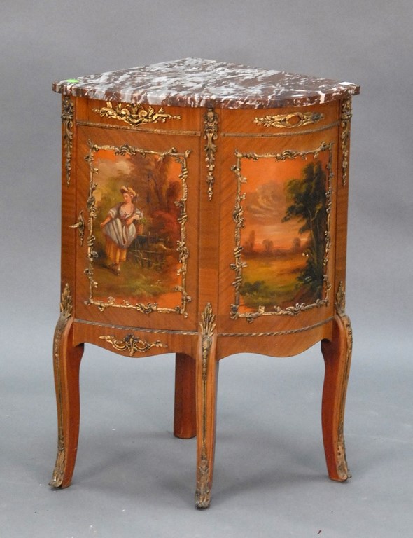 Louis XV style marble top corner cabinet with painted panels, ht. 31 in. wd. 22in.