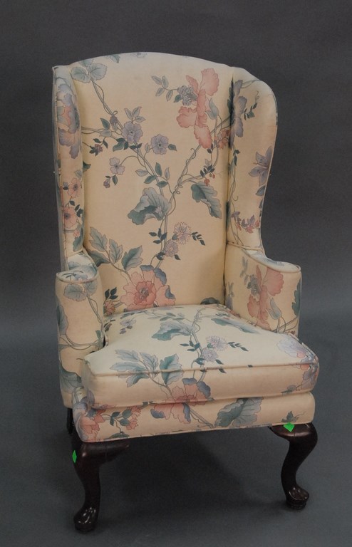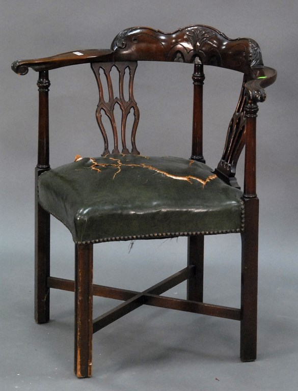 Custom mahogany centennial Chippendale style corner chair with leather seat leather as is, marked Colonial Zeeland MI.