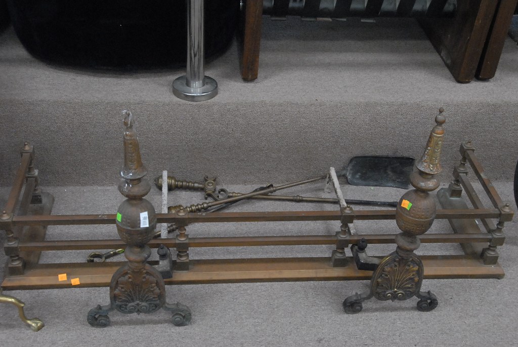 Fireplace grouping to include a pair of heavy brass Regency style andirons and brass fire fender.