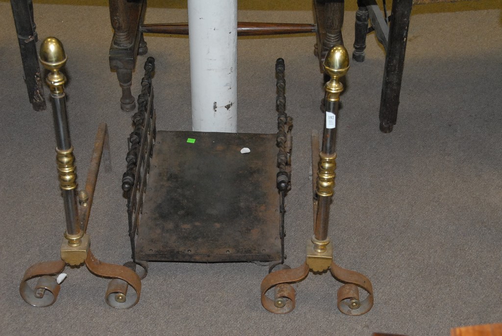 Three piece lot to include iron log holder and pair of brass and steel andirons.