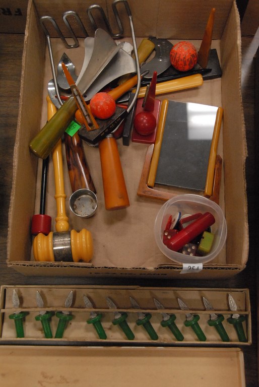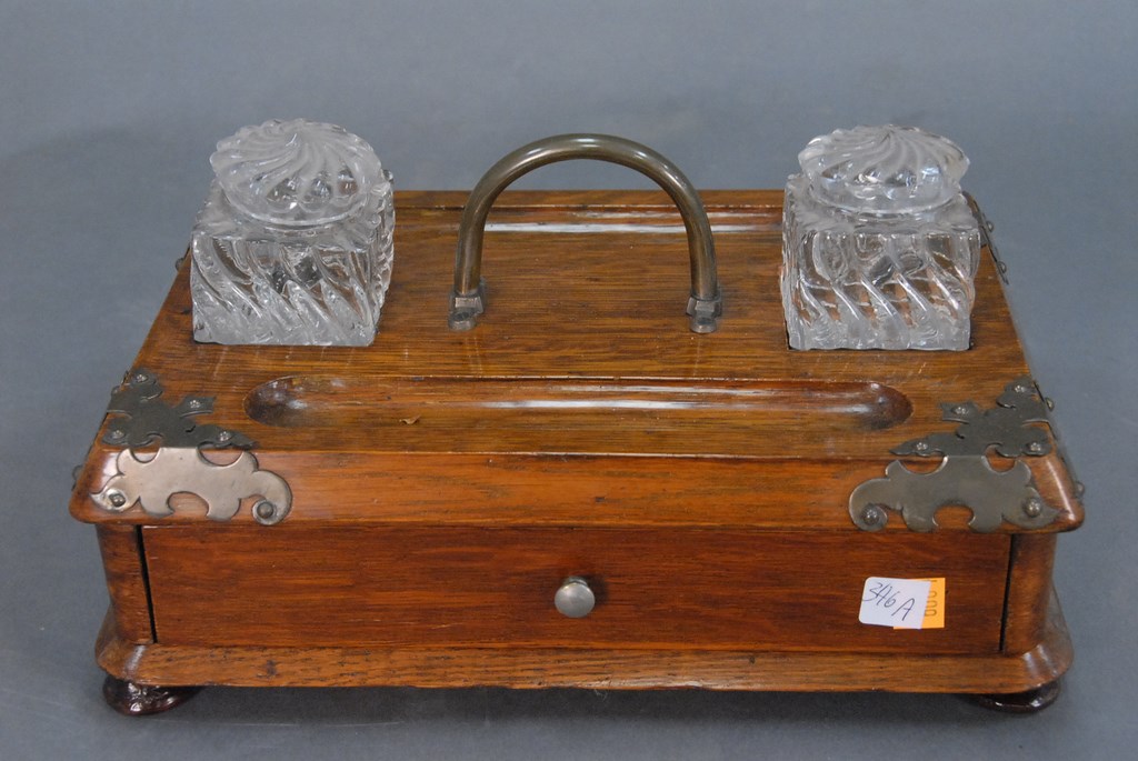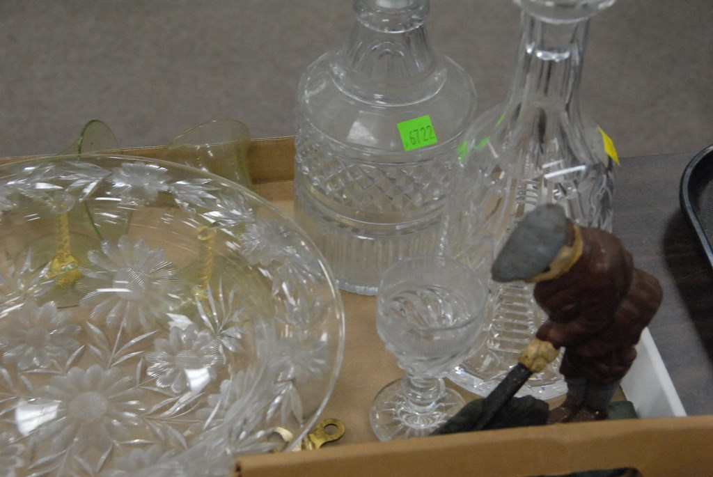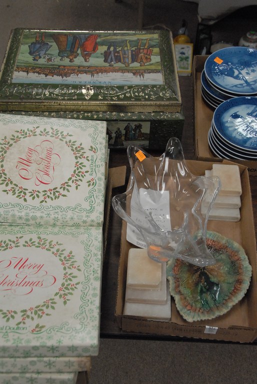 Two box lots: large tin box, Royal Doulton Christmas place, Daum France crystal bowl, Majolica leaf crystal bowl, marble bookends.
