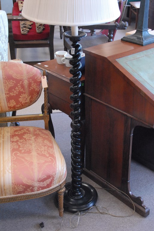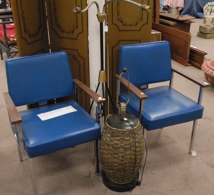 Pair of Signore office armchairs along with tripod floor lamp and table lamp.
