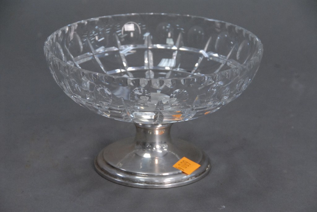Group lot: three cut crystal pieces, Dresden cups and saucers, and golf door stop.