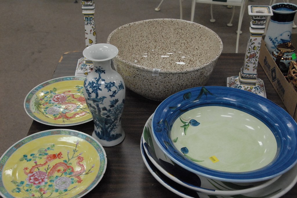 Group of porcelain and ceramic items to include blue and white Chinese porcelain vase, pair of Chinese dragon plates, pair of candlesticks, and four bowls.