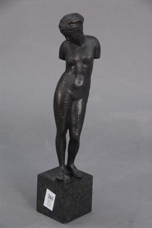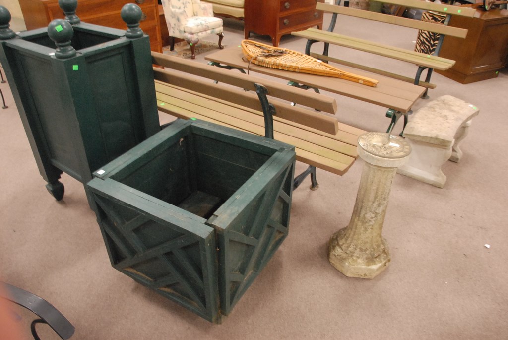 Group lot: small cement bench, cement pedestal with sun dial, and two wooden planters.