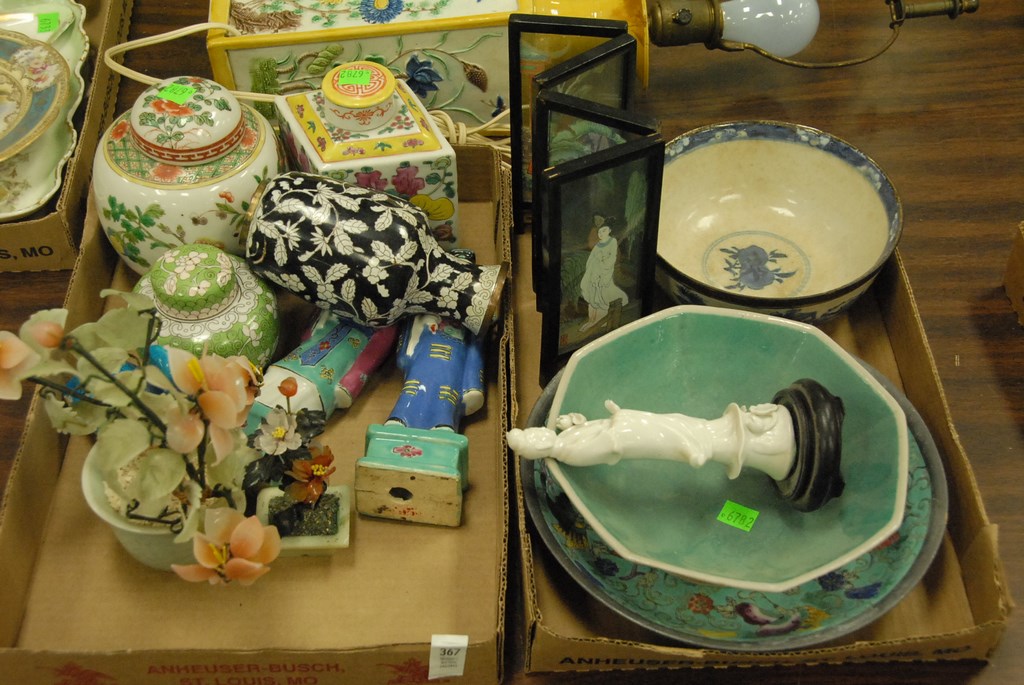 Two box lot of Asian items: several bowls, covered containers, tea jar, figures, hardstone plant, and lamp as is.