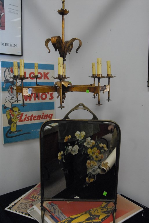 Two piece lot: hanging light, decorative framed mirror / firescreen.