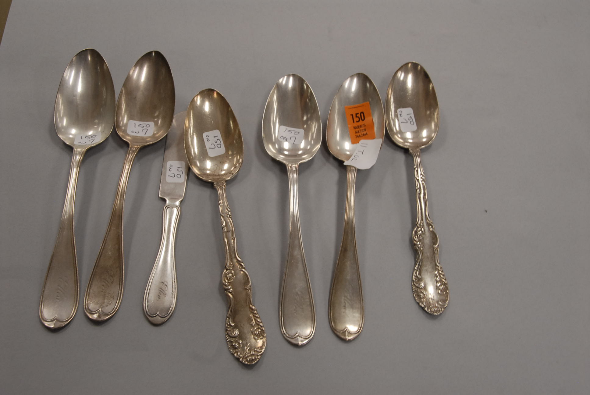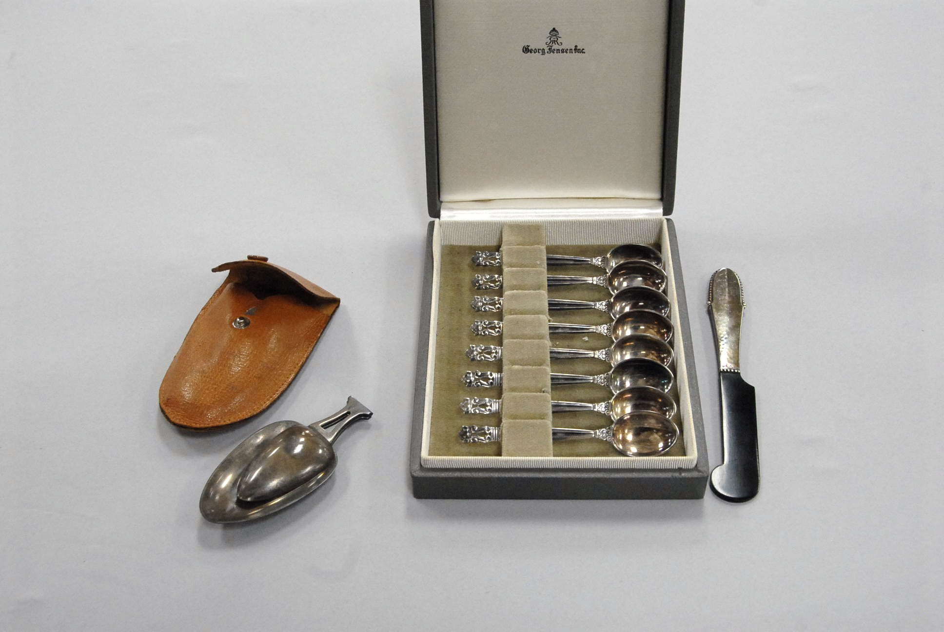 Lot of silver including 8 Georg Jensen demitase spoons, Georg Jensen knife with a silver handle plus a silver travel spoon in a leather case
