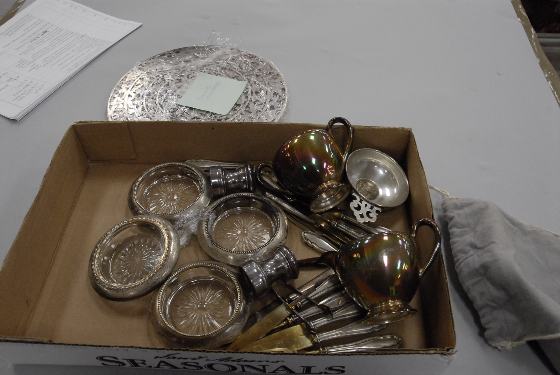 A lot of sterling silver to include a hot plate with glass and sterling overlay, sugar and creamer, small porringer, coasters, salt shakers and silver handled knives
