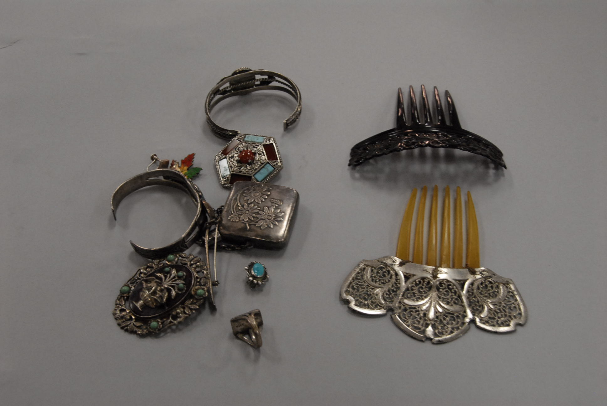A bag lot of sterling silver to include a small perfume, two pins, bracelets, and a ring along with a couple Victorian hair combs