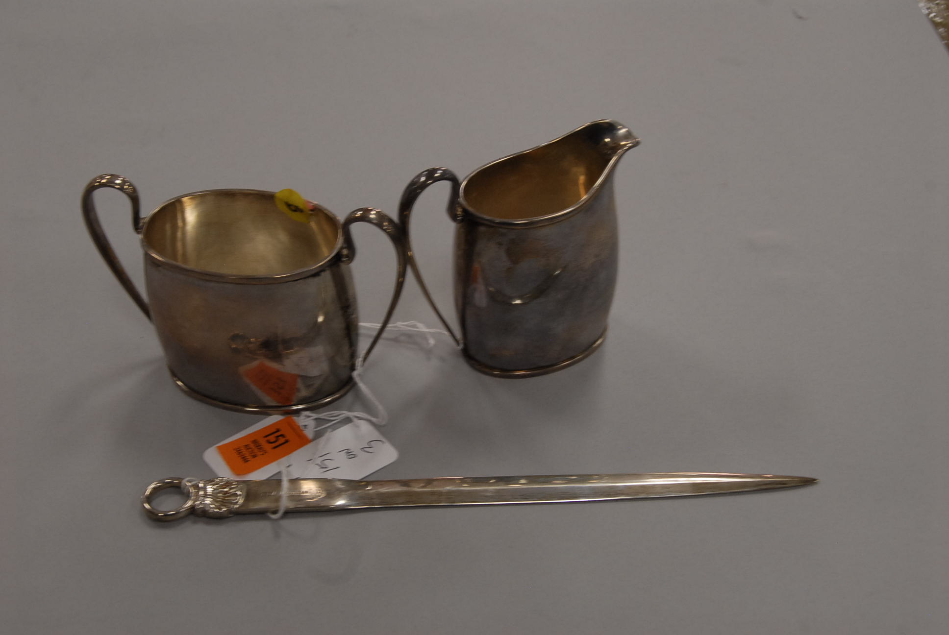 Sterling silver lot to include a sugar, creamer and a letter opener