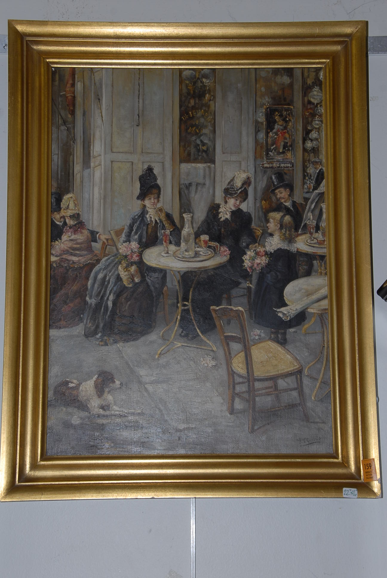 Oil on board reproduction painting, Edwardo Leon Garrido’s 1884 interior scene of women in a cafe