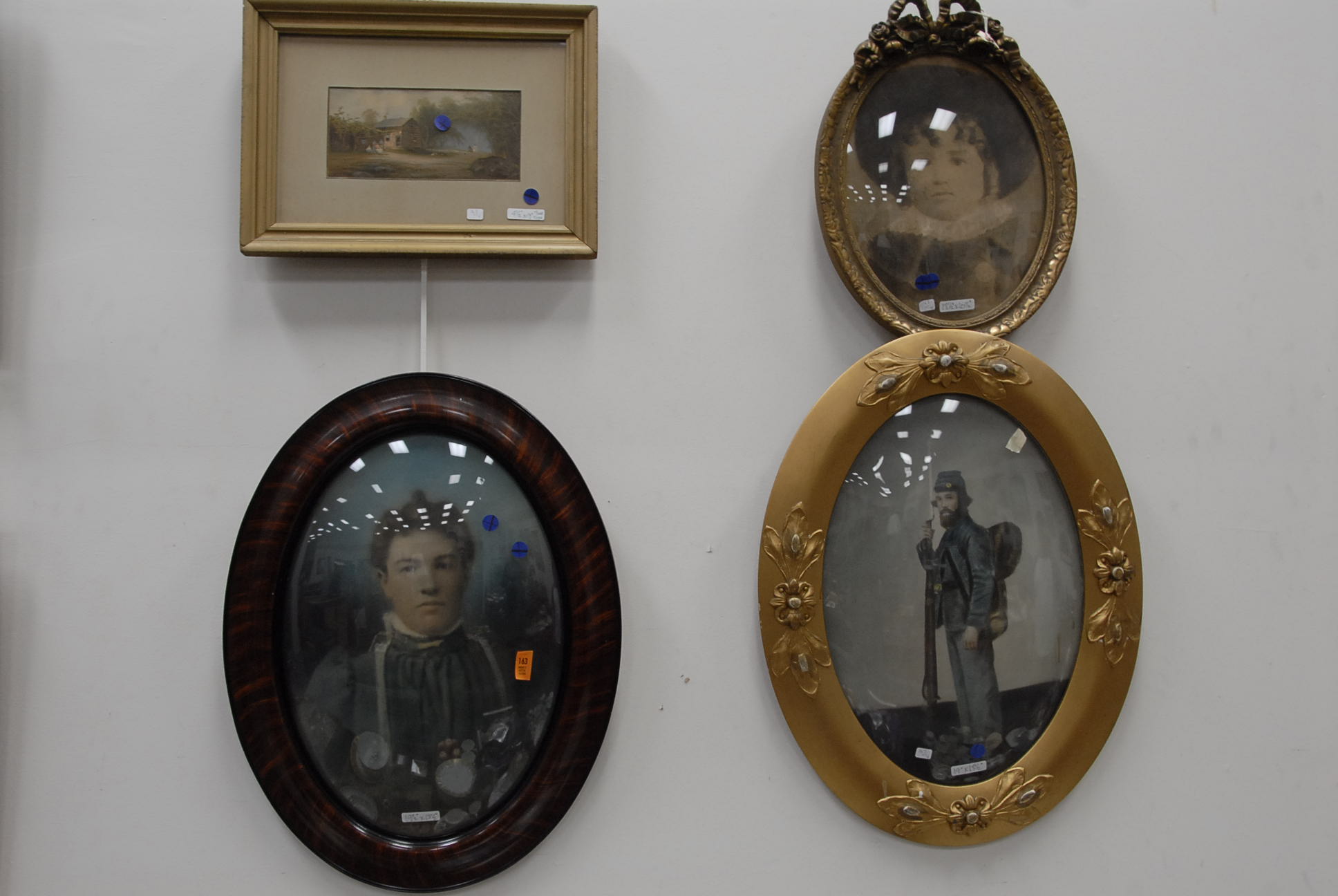 Four framed portraits, one is a civil war soldier with a gun, all with bowed glass frames