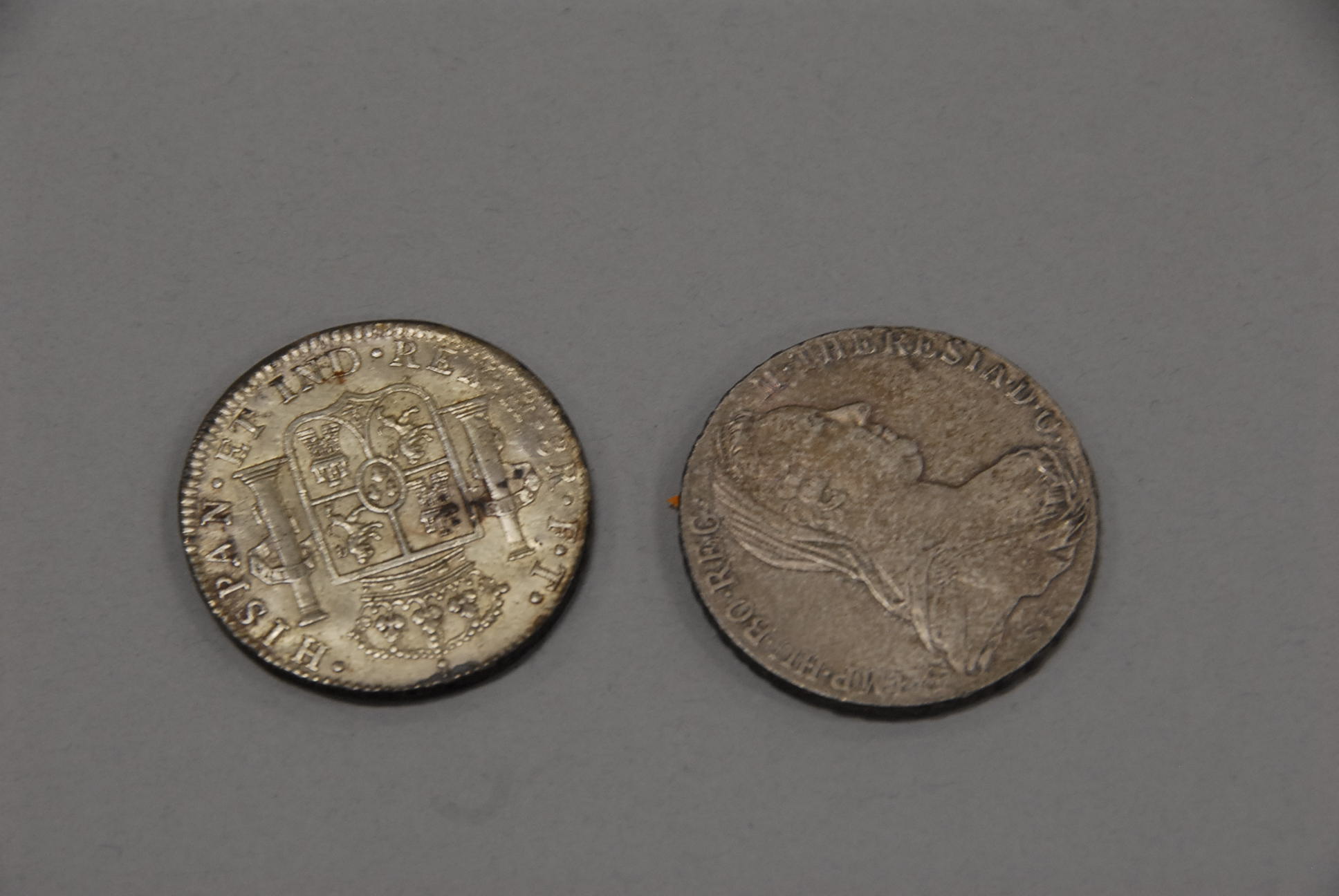 Two large foreign coins, one is 18th century, one is a US Connecticut half dollar