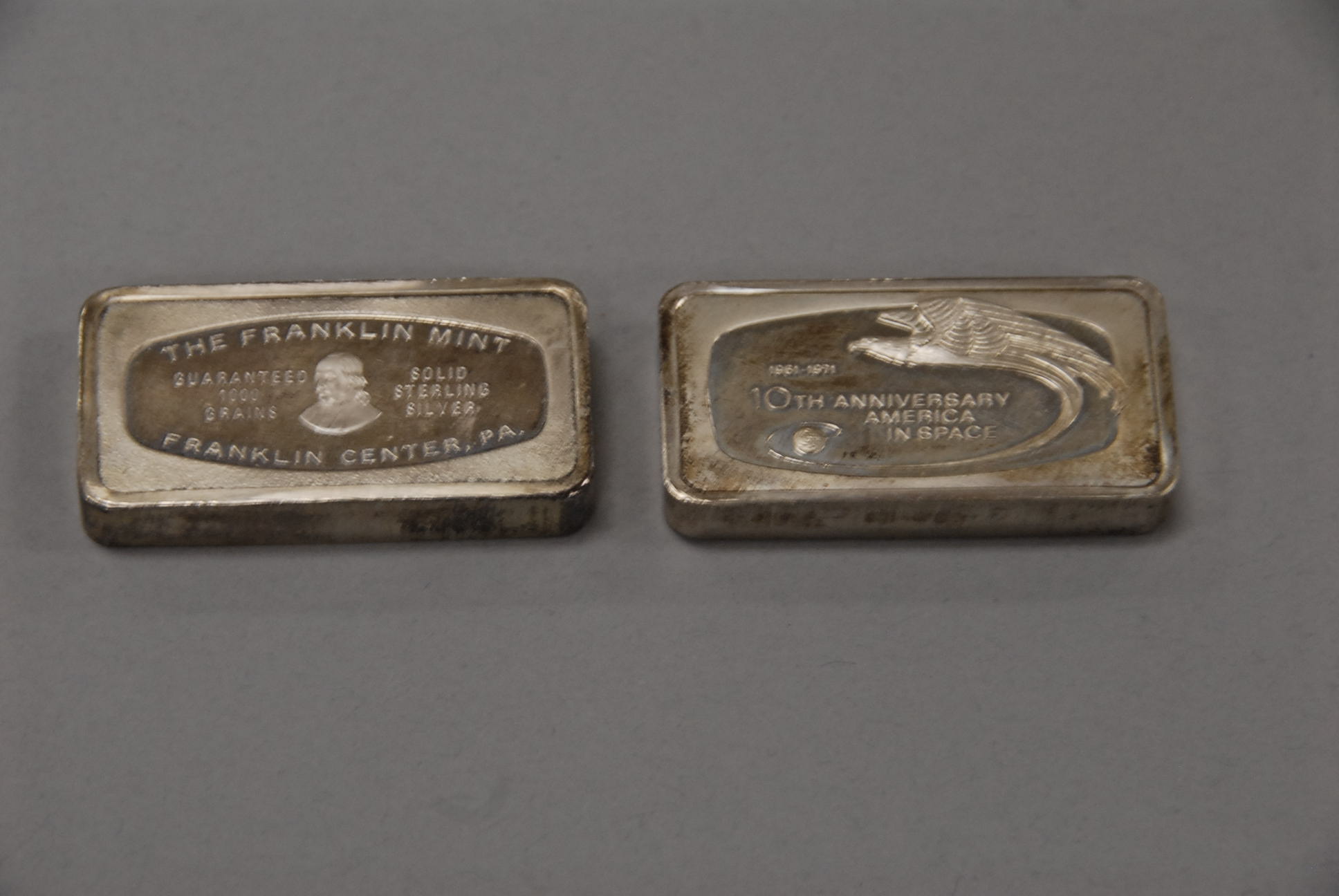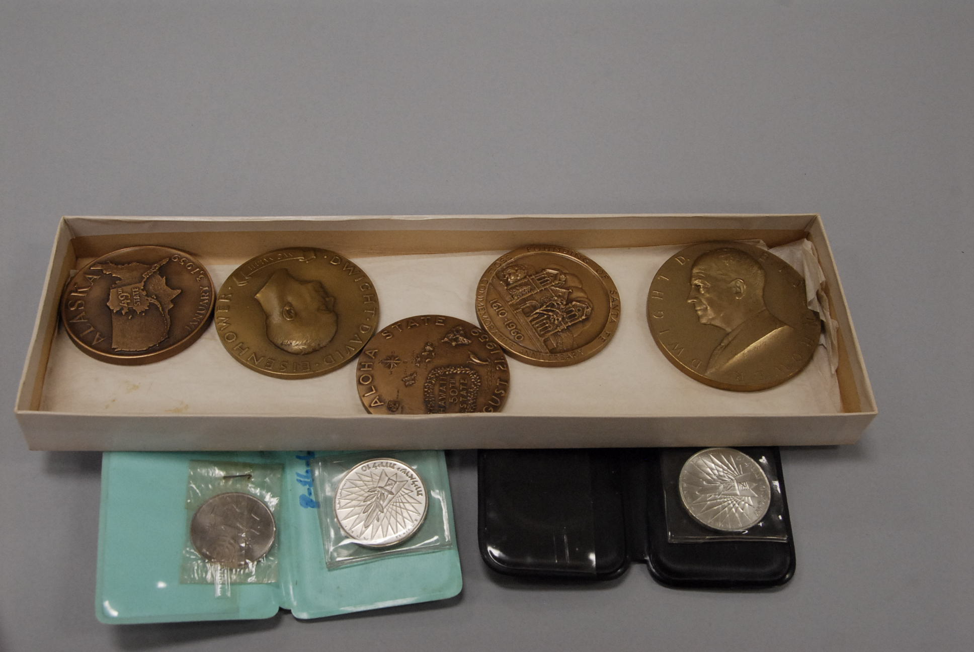 Group of five bronze medals and three Israeli commemorative coins with two sterling silver bars