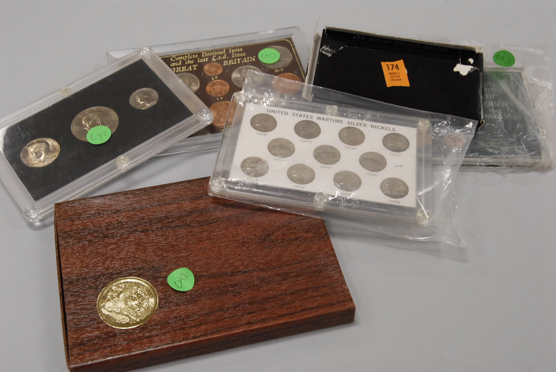 Lot to include 1973 proof set, 1976 unc three piece set, two English pence sets, Eisenhower proof one dollar, and group of nickels