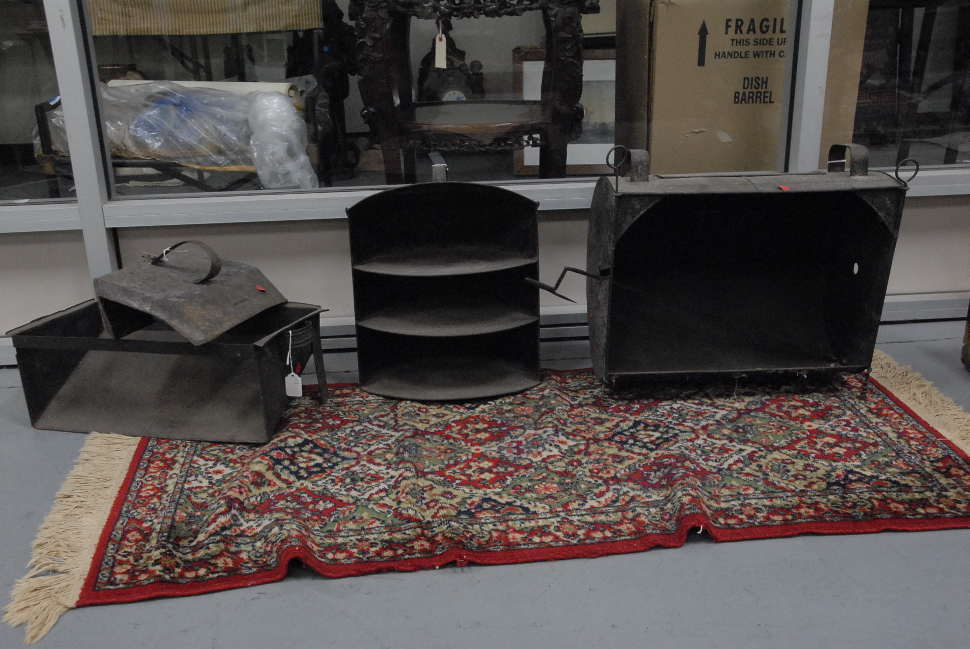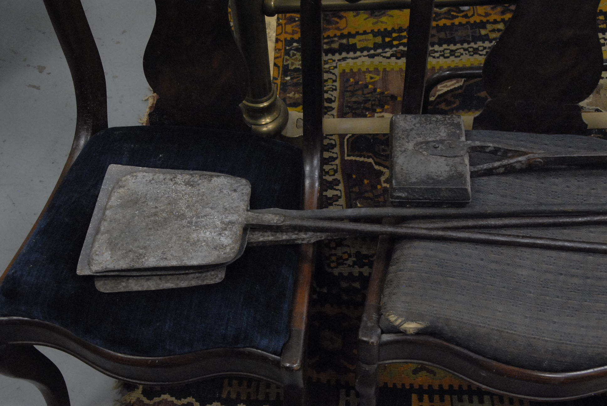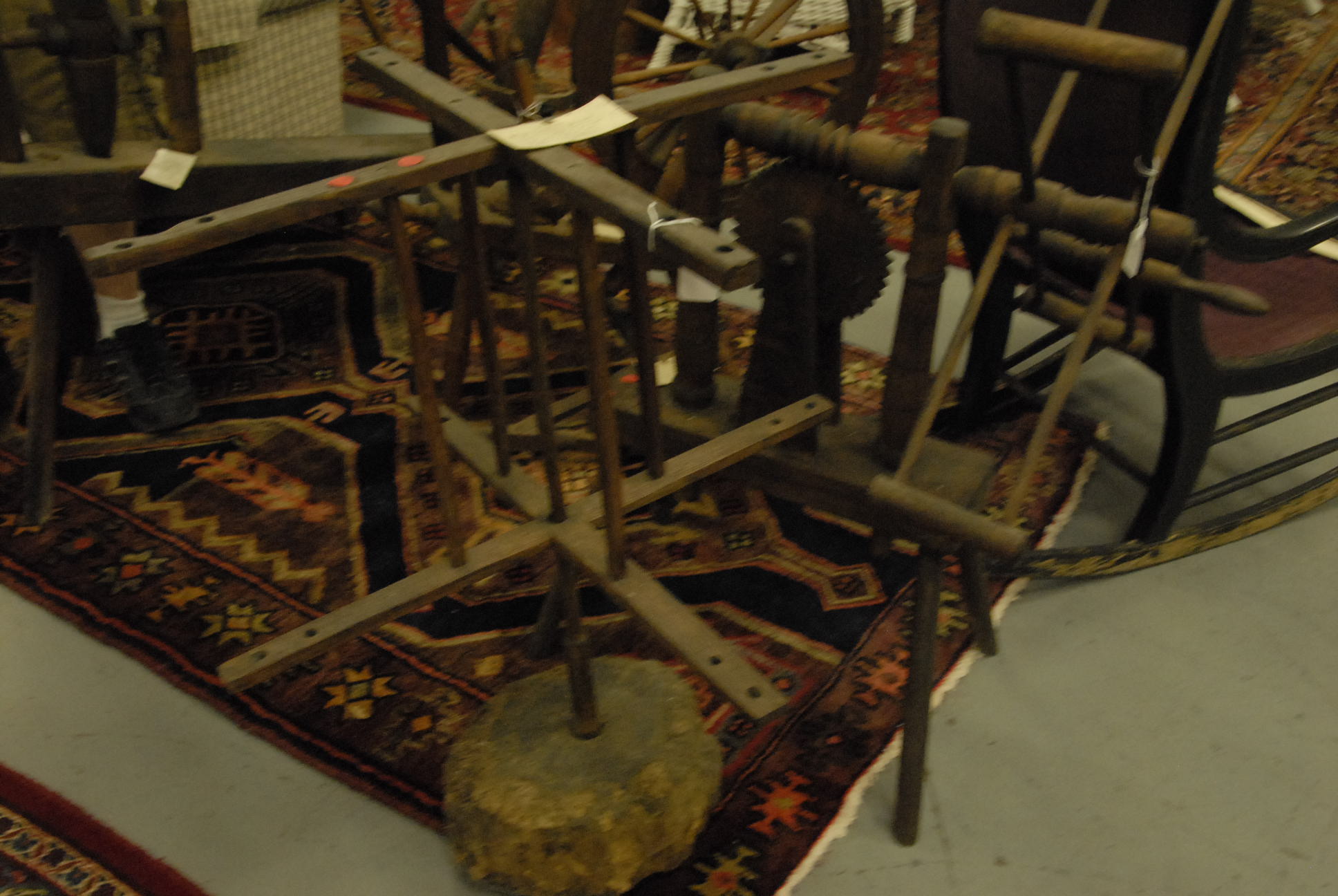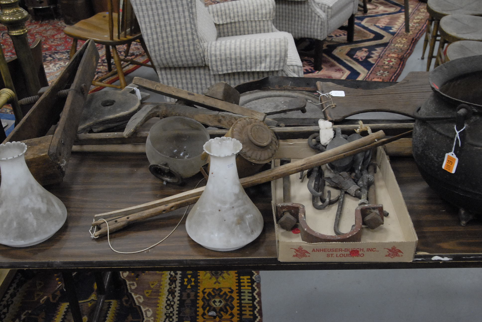 Group lot of primitive items to include two iron buckets, one as is, a brass bucket, two pully systems, two pullys with bolts, three hooks and a large iron bracket, two primitive wooden items, a large iron bracket, two iron pans, two various iron pieces, various wooden tools, a wooden harness vice, two oil lamp shades, three oil lamp shades, a bellows, a boot puller and a tape loom