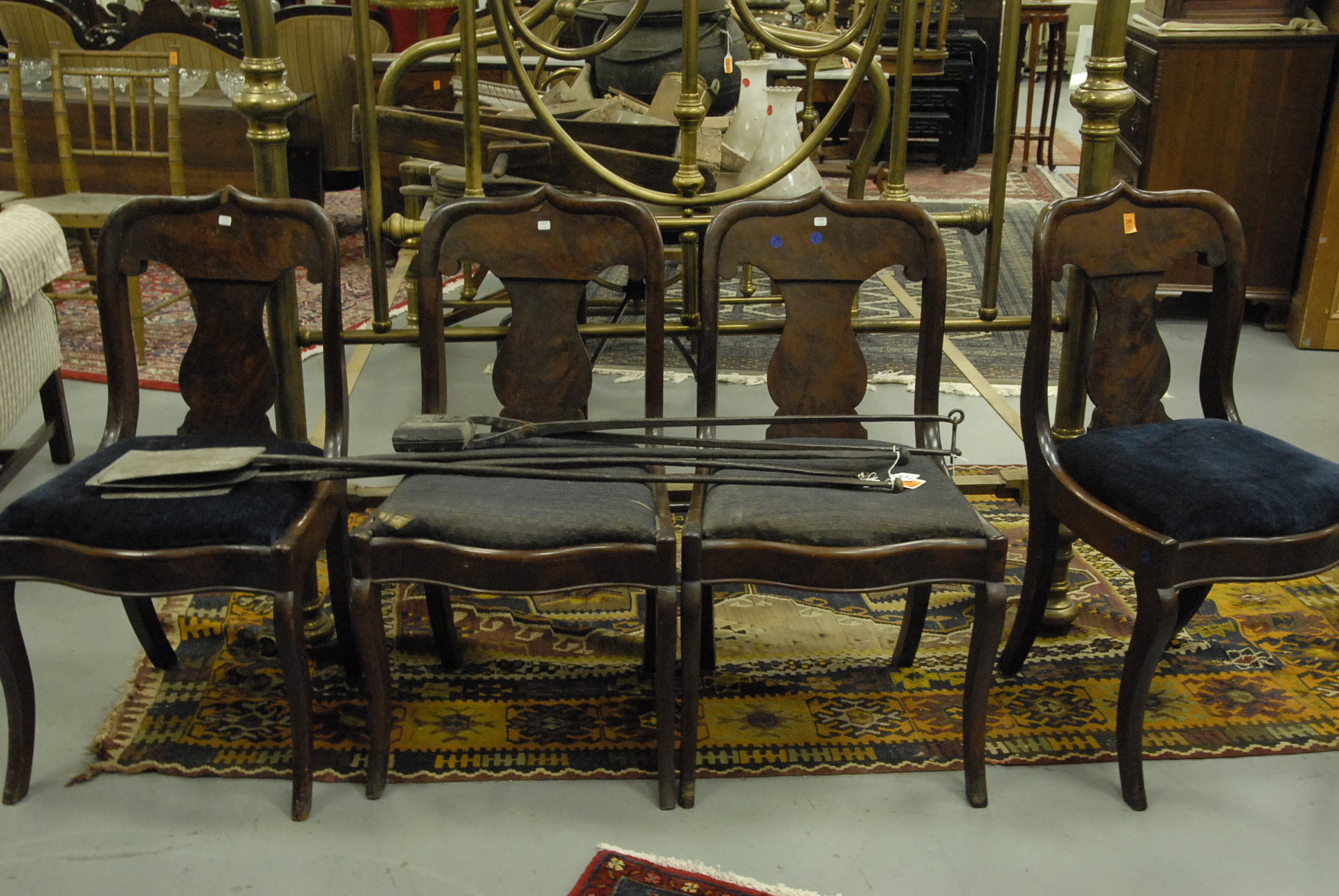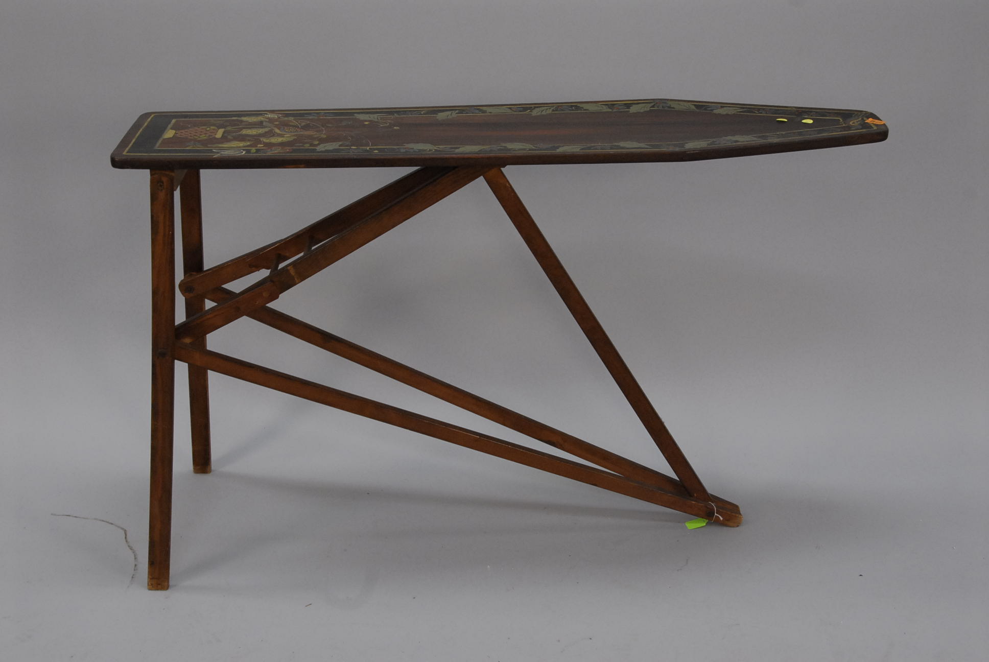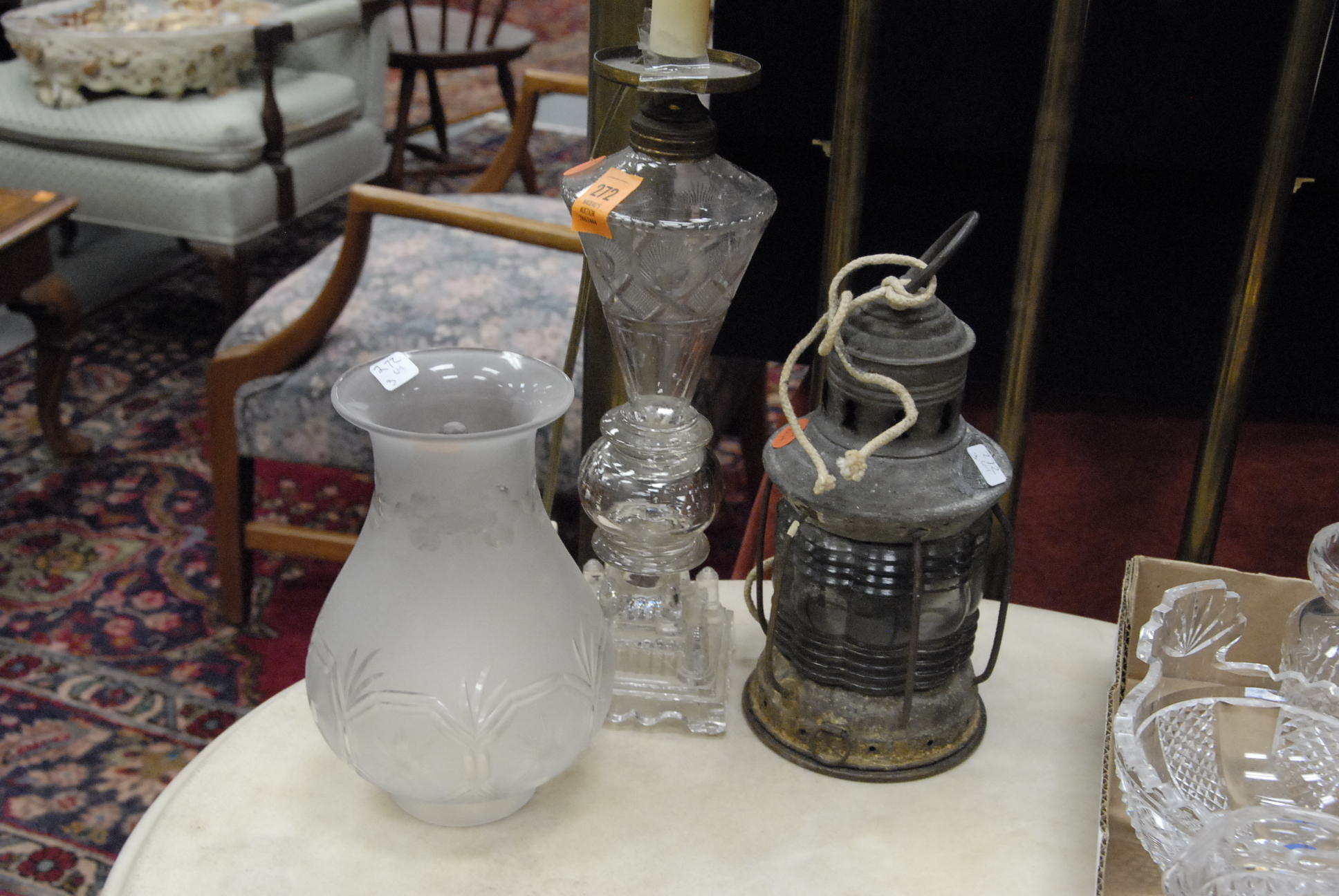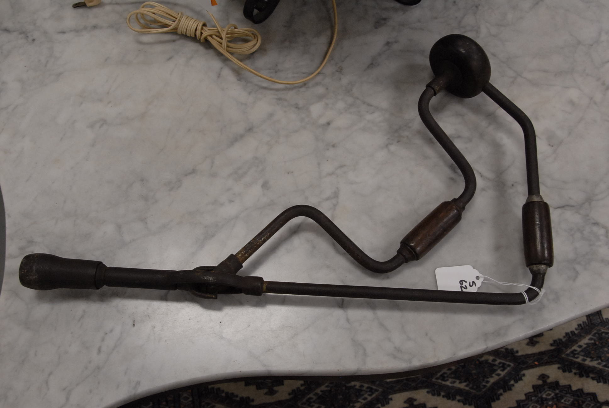 Group lot of primitive items to include two iron buckets, one as is, a brass bucket, two pully systems, two pullys with bolts, three hooks and a large iron bracket, two primitive wooden items, a large iron bracket, two iron pans, two various iron pieces, various wooden tools, a wooden harness vice, two oil lamp shades, three oil lamp shades, a bellows, a boot puller and a tape loom