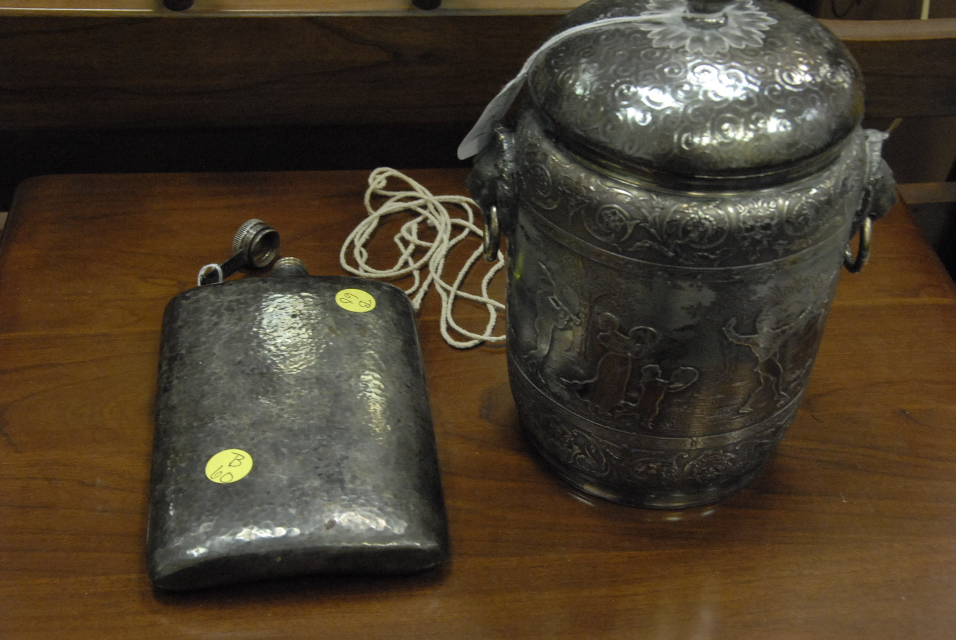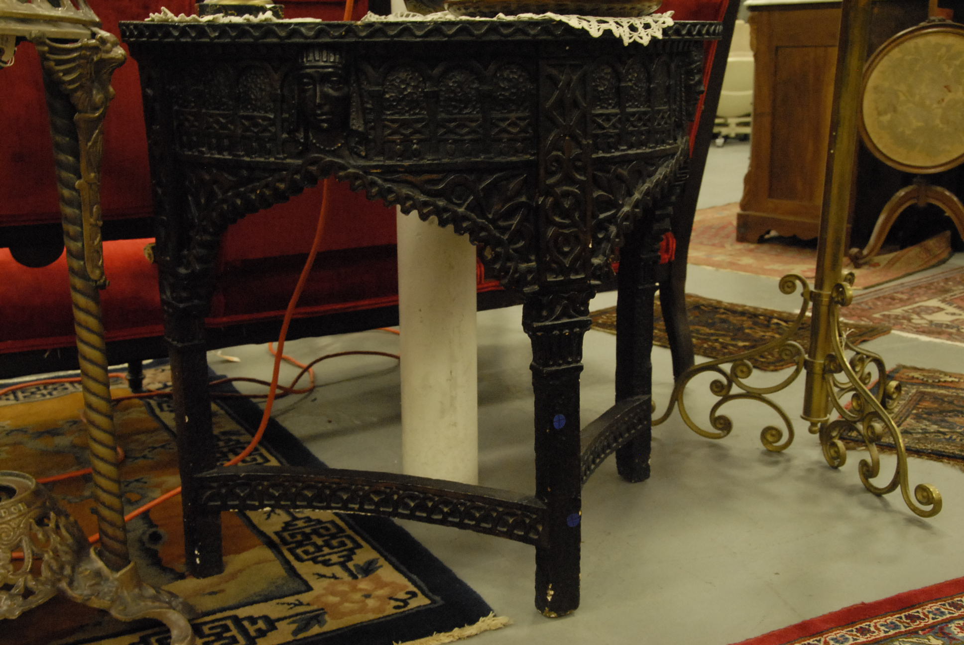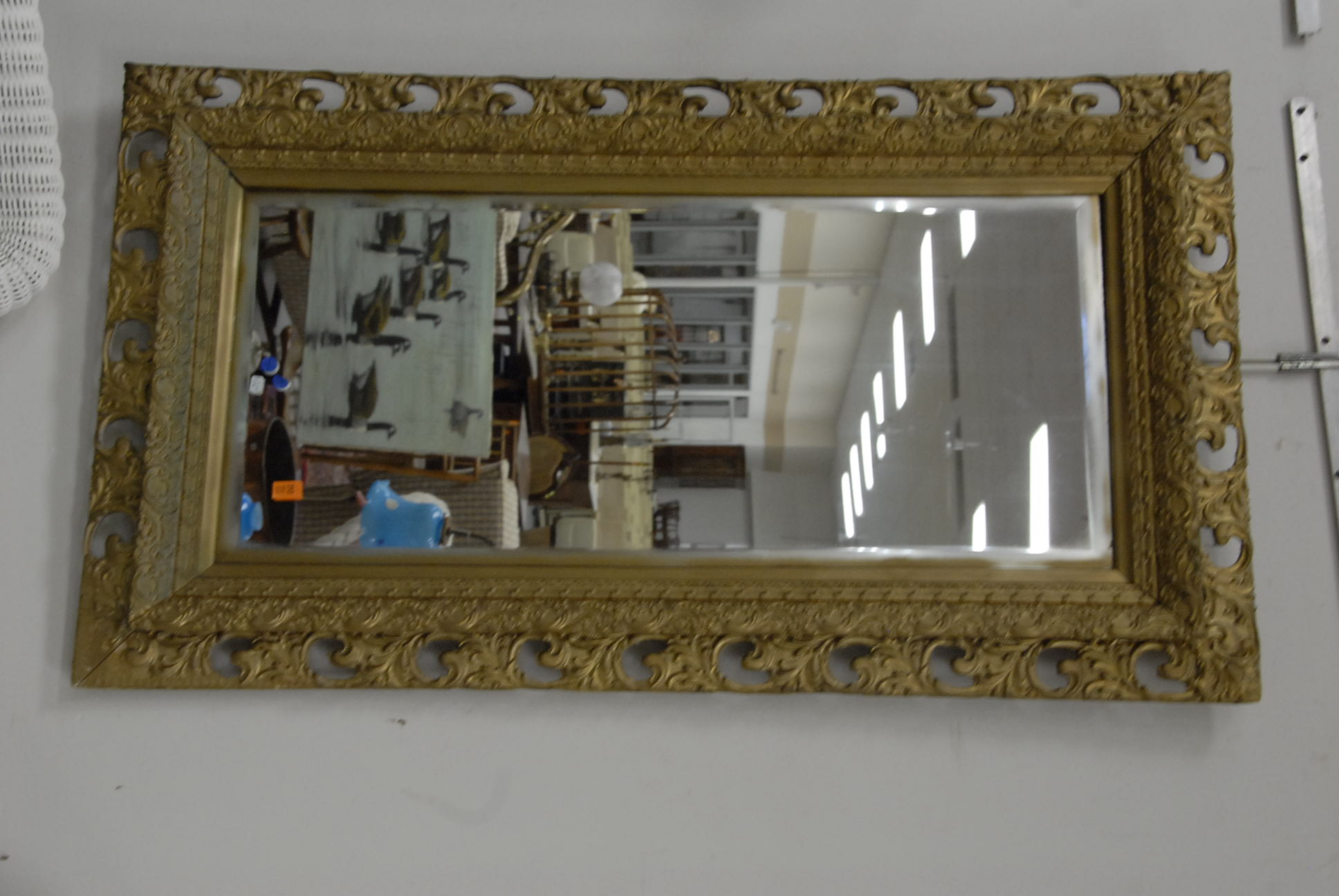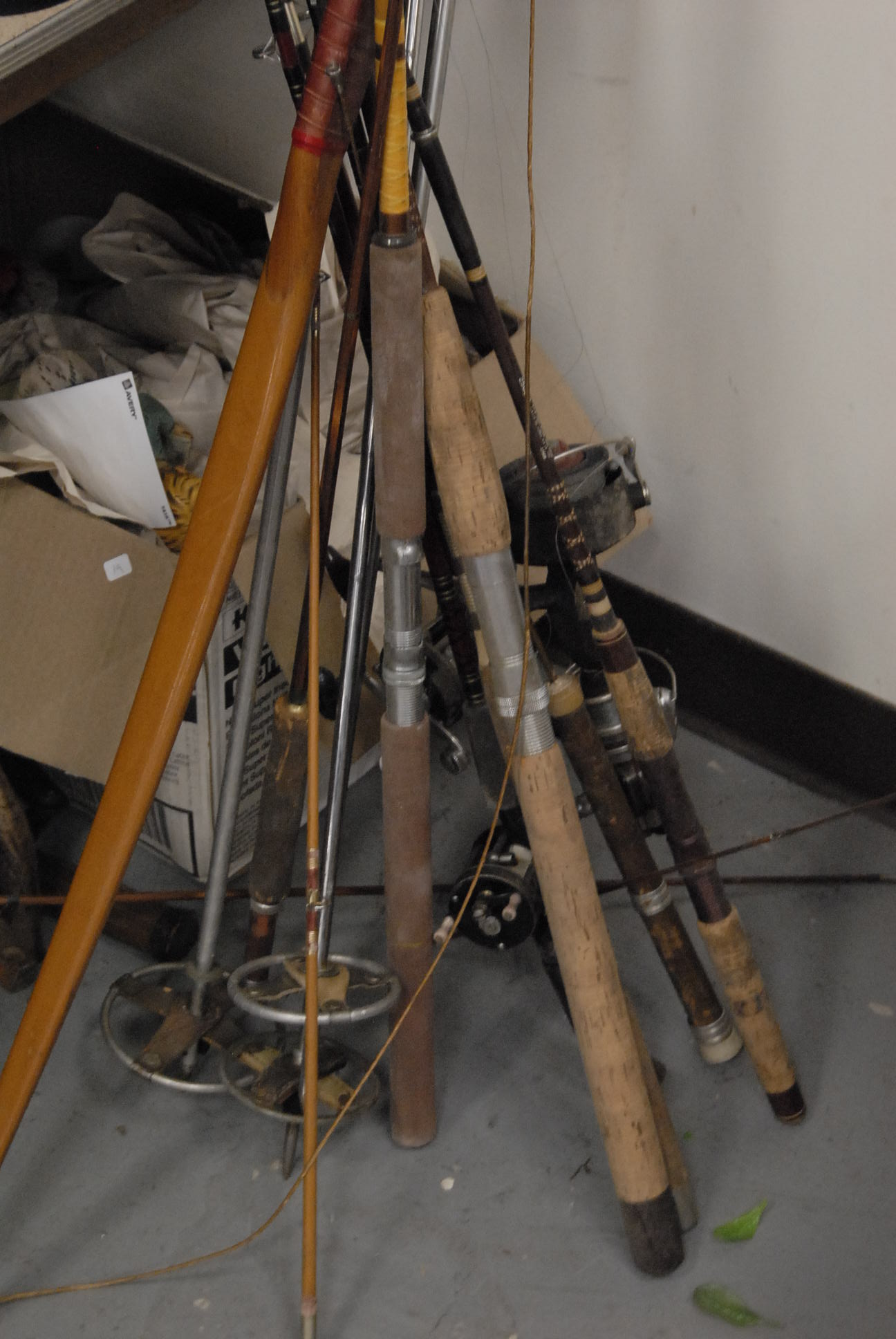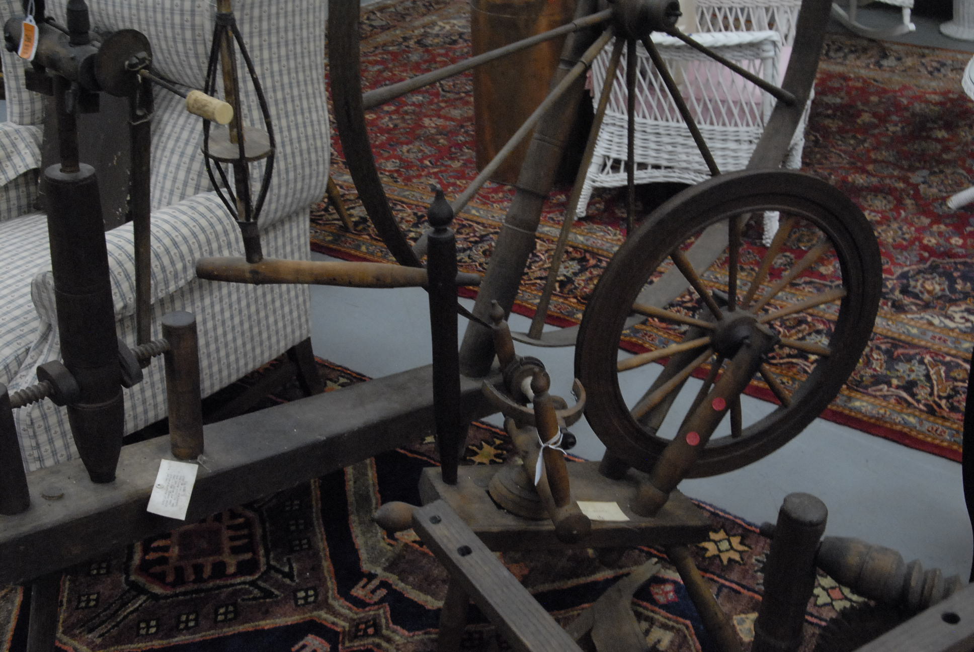Group lot of primitive items to include two iron buckets, one as is, a brass bucket, two pully systems, two pullys with bolts, three hooks and a large iron bracket, two primitive wooden items, a large iron bracket, two iron pans, two various iron pieces, various wooden tools, a wooden harness vice, two oil lamp shades, three oil lamp shades, a bellows, a boot puller and a tape loom