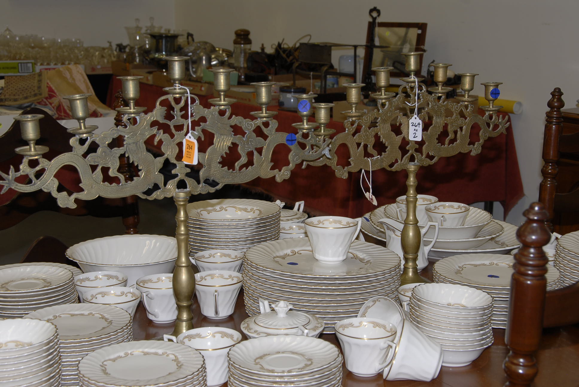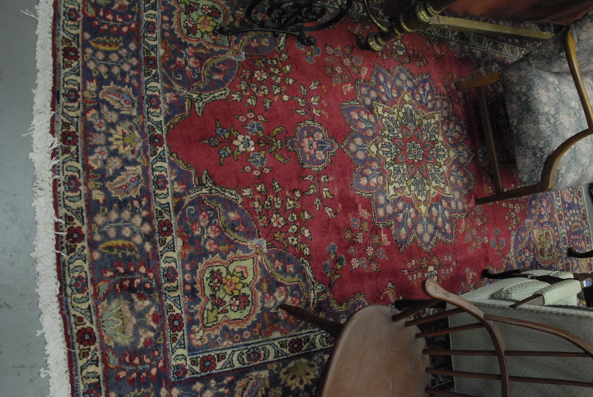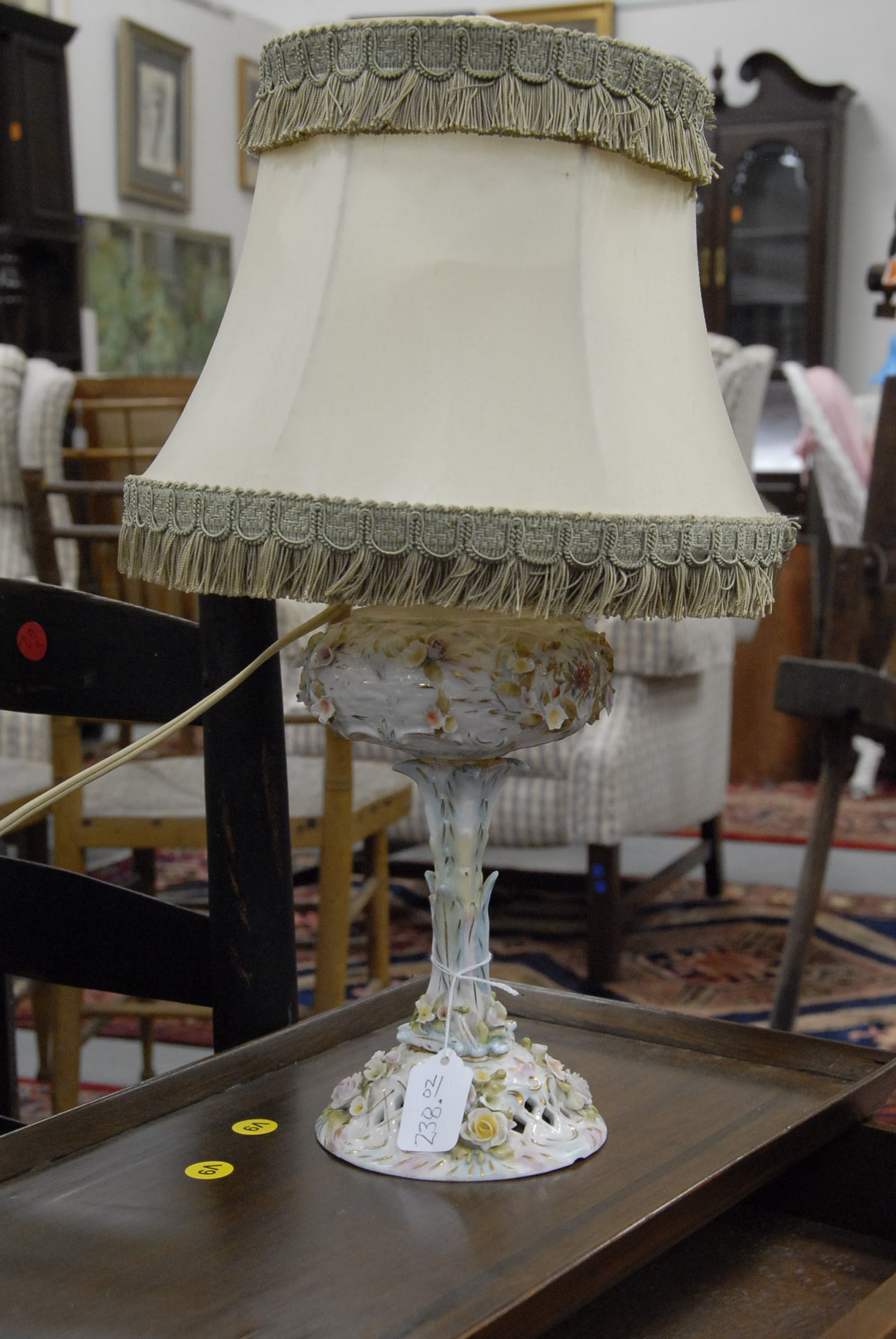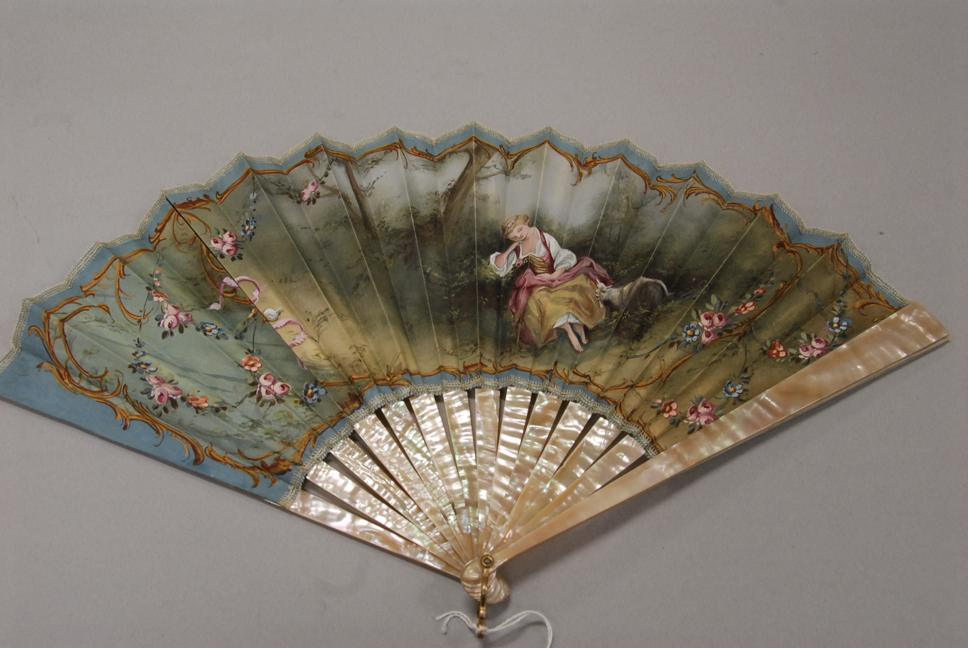 Group lot of primitive items to include two iron buckets, one as is, a brass bucket, two pully systems, two pullys with bolts, three hooks and a large iron bracket, two primitive wooden items, a large iron bracket, two iron pans, two various iron pieces, various wooden tools, a wooden harness vice, two oil lamp shades, three oil lamp shades, a bellows, a boot puller and a tape loom