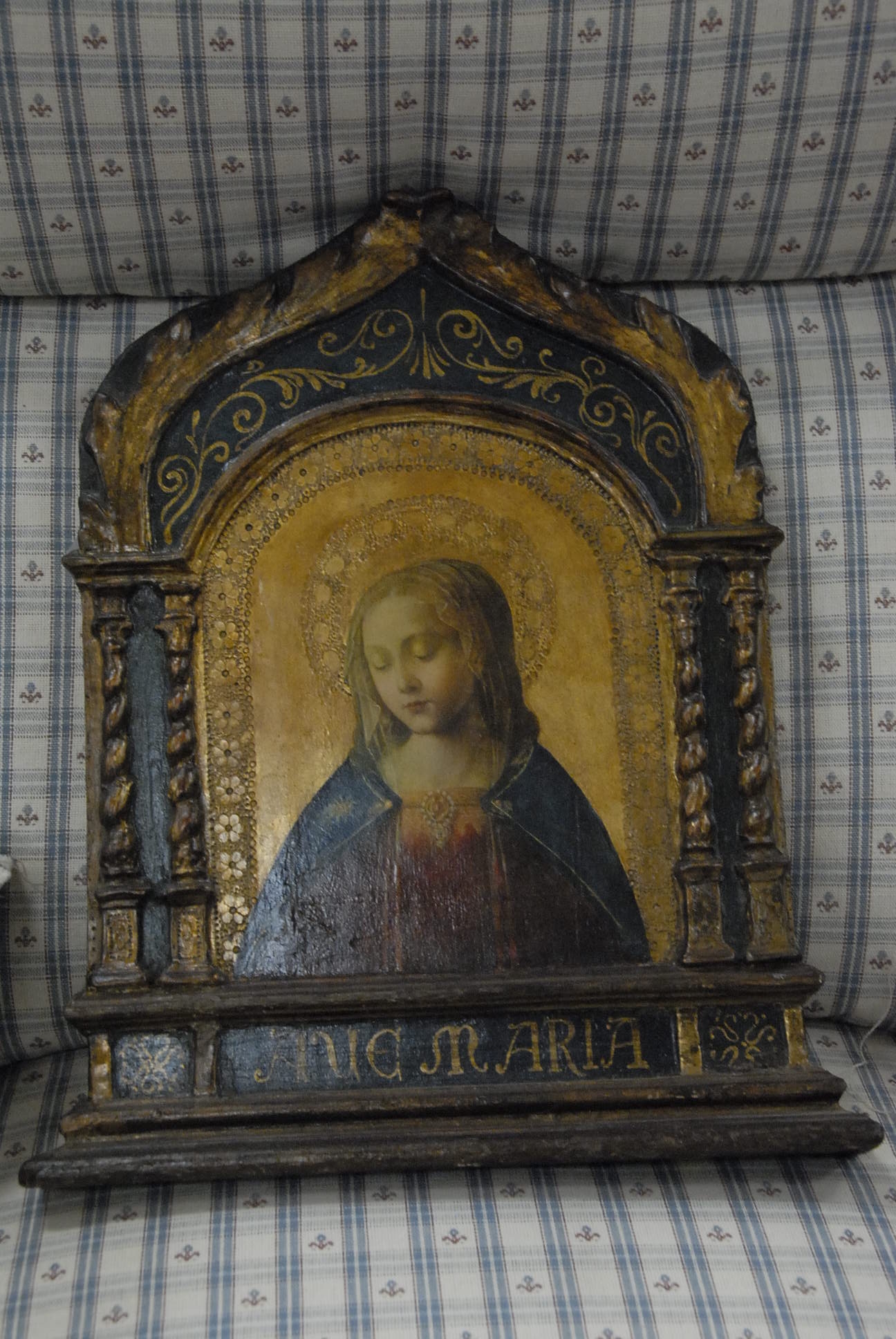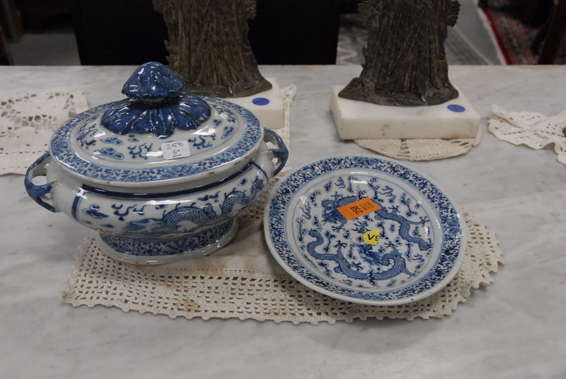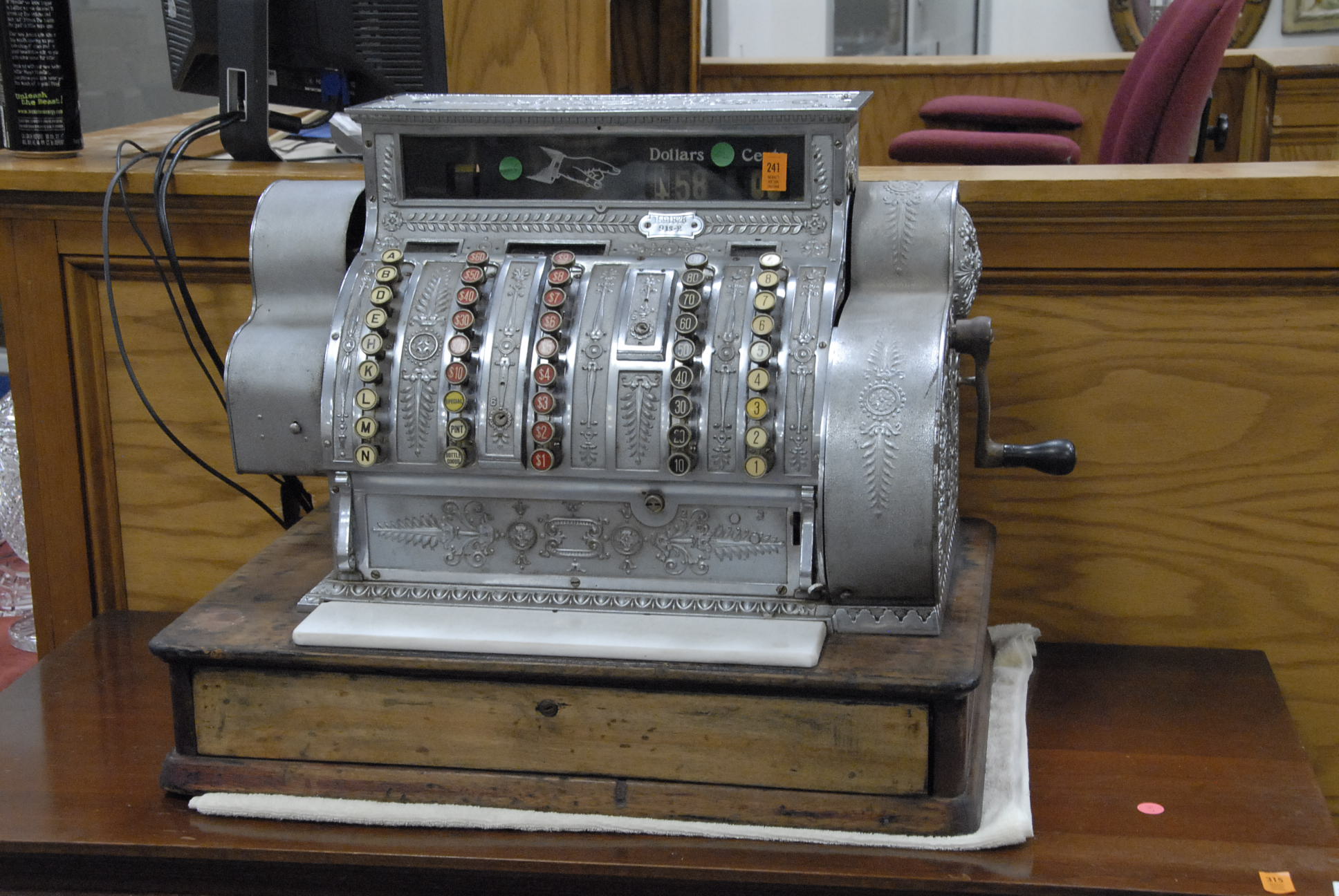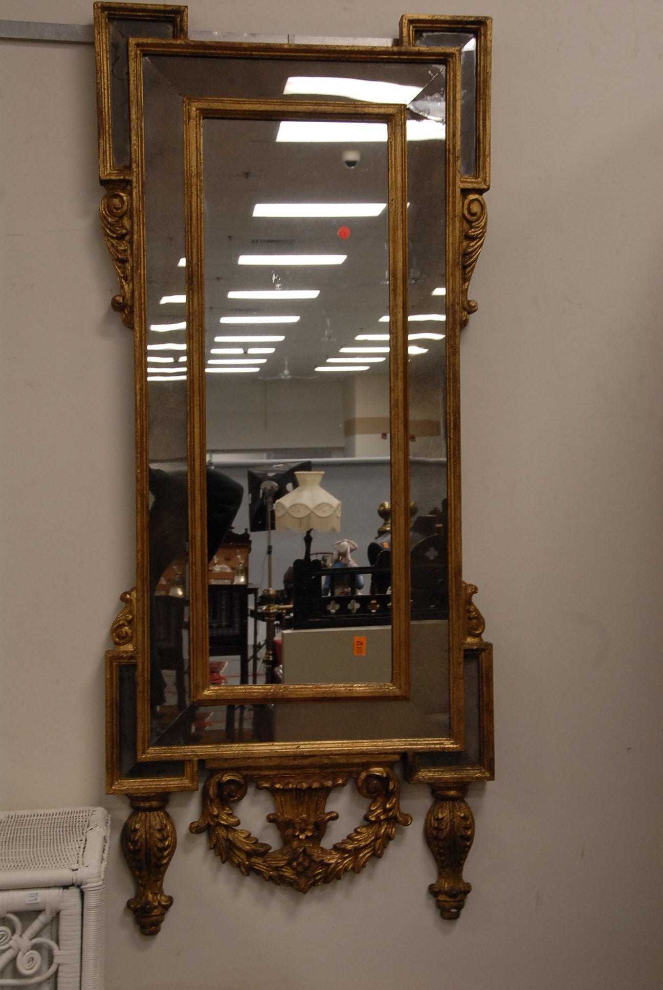 Group lot of primitive items to include two iron buckets, one as is, a brass bucket, two pully systems, two pullys with bolts, three hooks and a large iron bracket, two primitive wooden items, a large iron bracket, two iron pans, two various iron pieces, various wooden tools, a wooden harness vice, two oil lamp shades, three oil lamp shades, a bellows, a boot puller and a tape loom